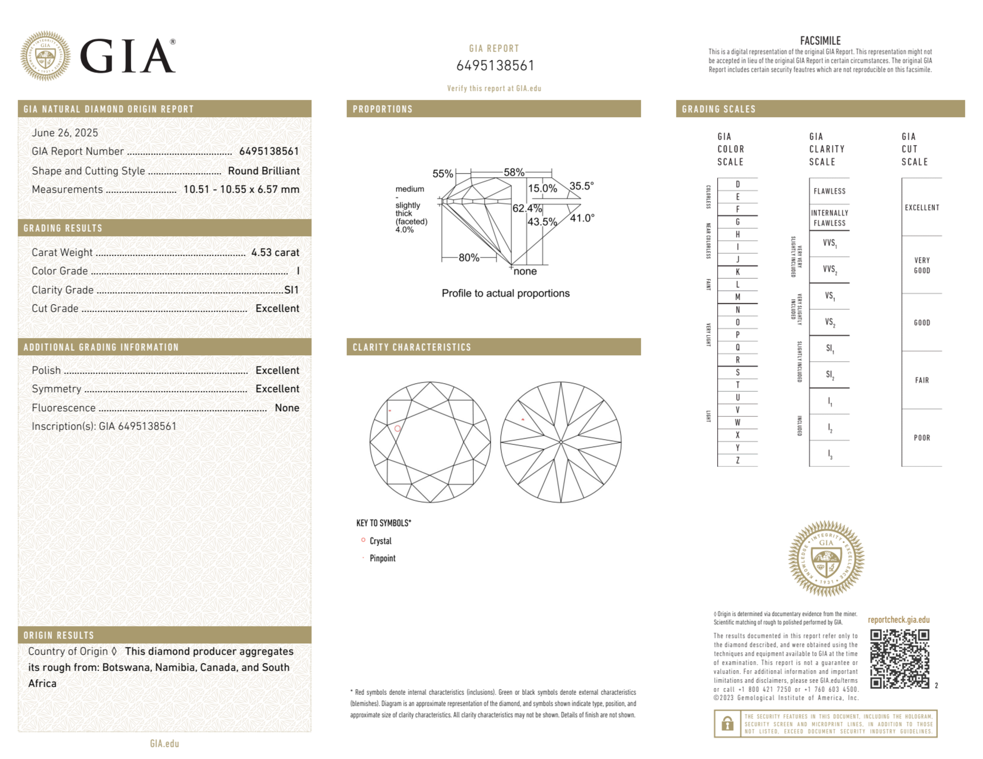 Your 4.53 carat Round natural diamond is graded SI1 clarity, which stands for Slightly Included 1. Read more about SI1 clarity diamonds here, or learn more about diamond clarity in general here.