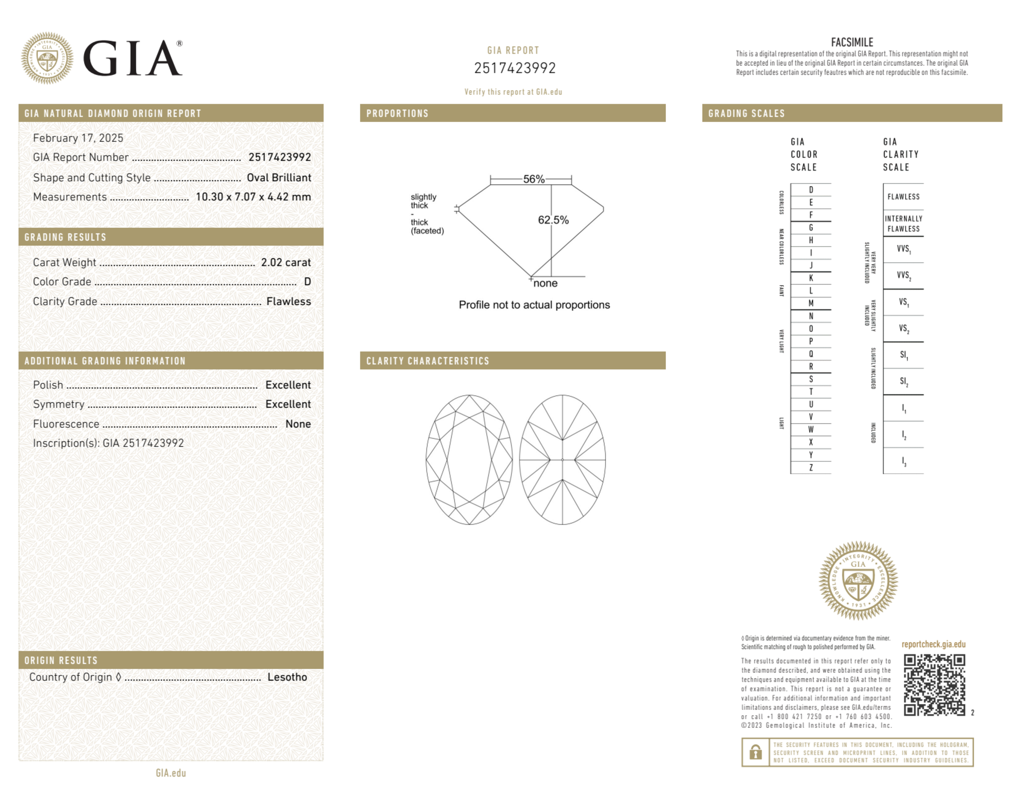 Your 2.02 carat Oval natural diamond is graded FL clarity, which stands for Flawless. Read more about FL clarity diamonds here, or learn more about diamond clarity in general here.