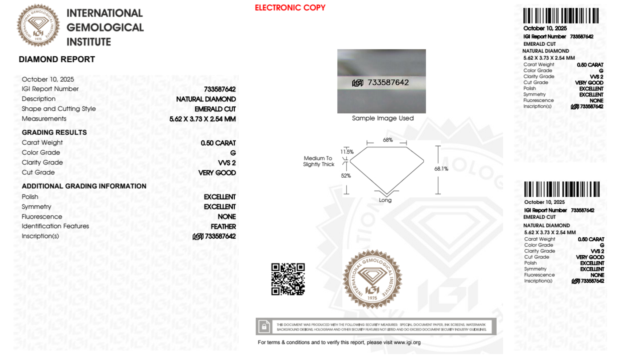 Your 0.50 carat Emerald natural diamond is graded VVS2 clarity, which stands for Very Very Slightly Included 2. Read more about VVS2 clarity diamonds here, or learn more about diamond clarity in general here.