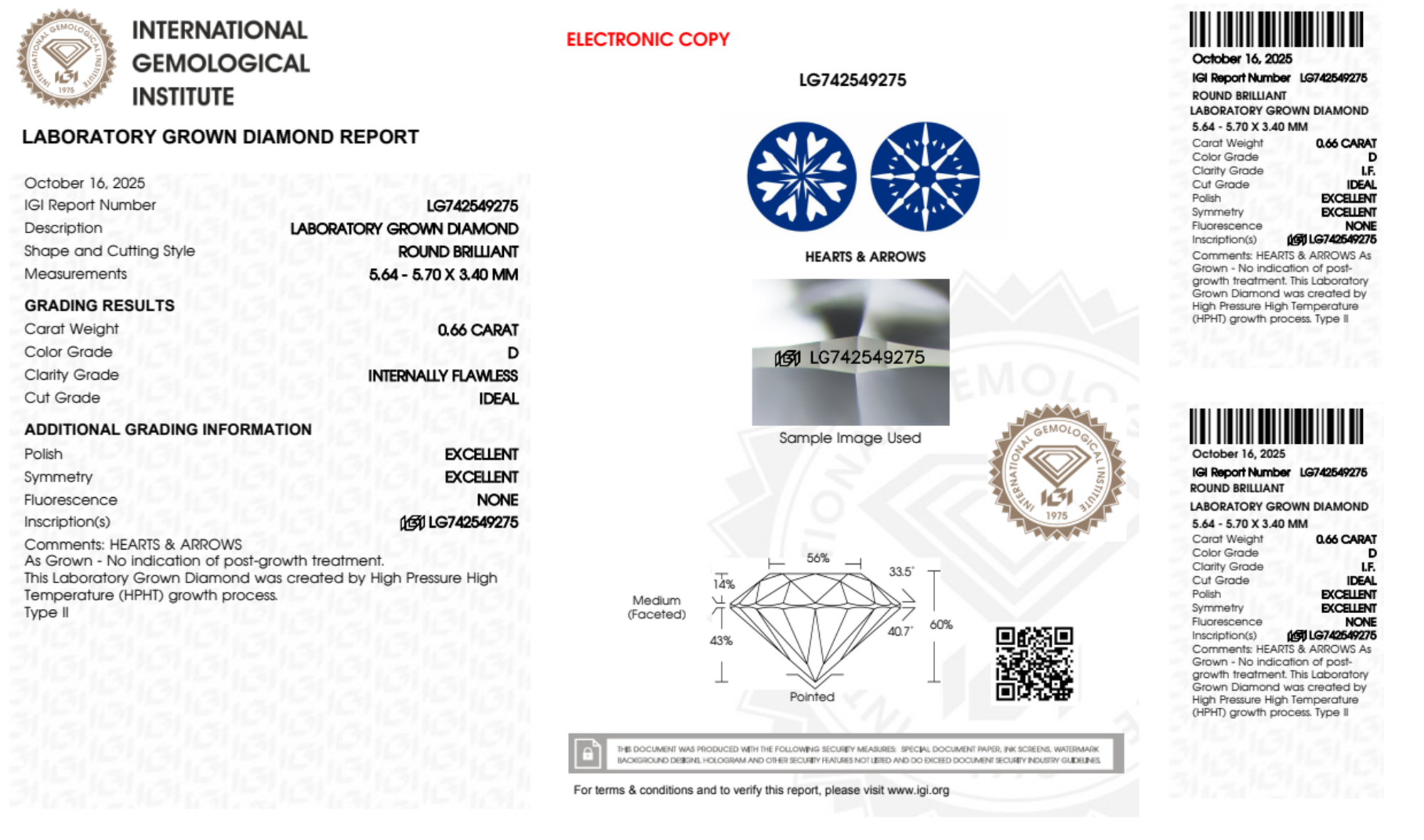 Your 0.66 carat Round lab diamond is graded IF clarity, which stands for Internally Flawless. Read more about IF clarity diamonds here, or learn more about diamond clarity in general here.