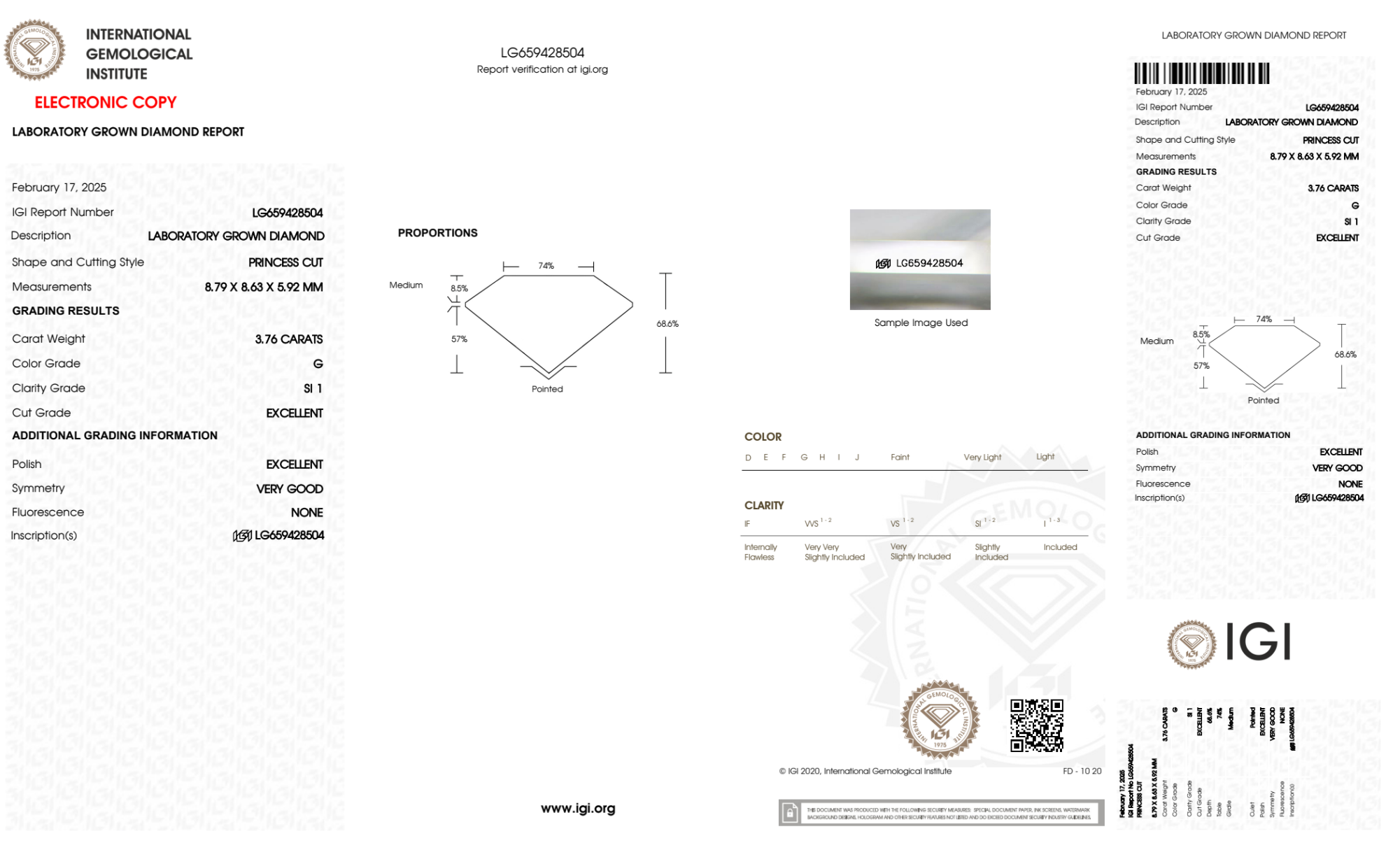Your 3.76 carat Princess lab diamond is graded G color (Near Colorless), and you can read more about G color diamonds here.