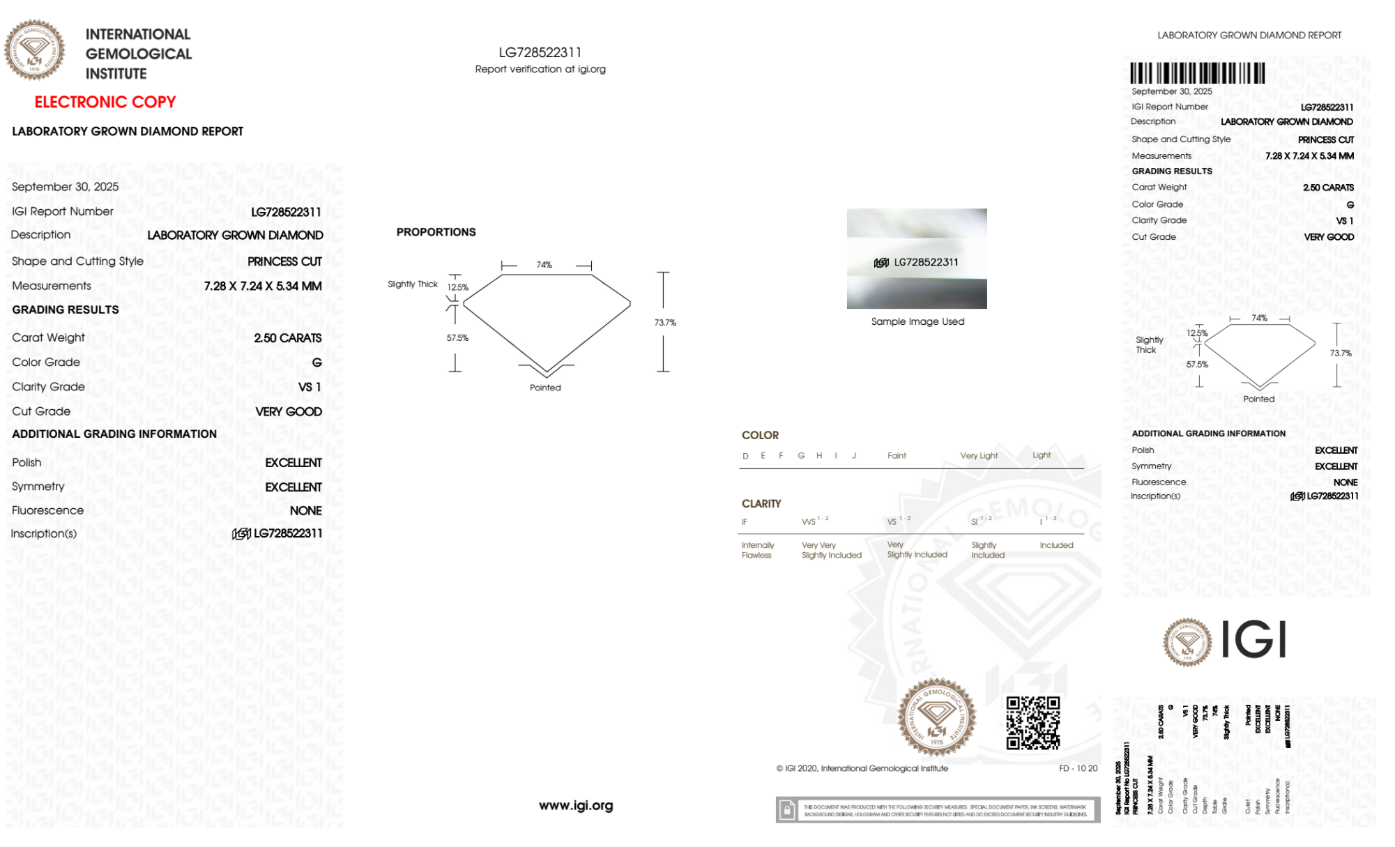 Your 2.50 carat Princess lab diamond is graded G color (Near Colorless), and you can read more about G color diamonds here.