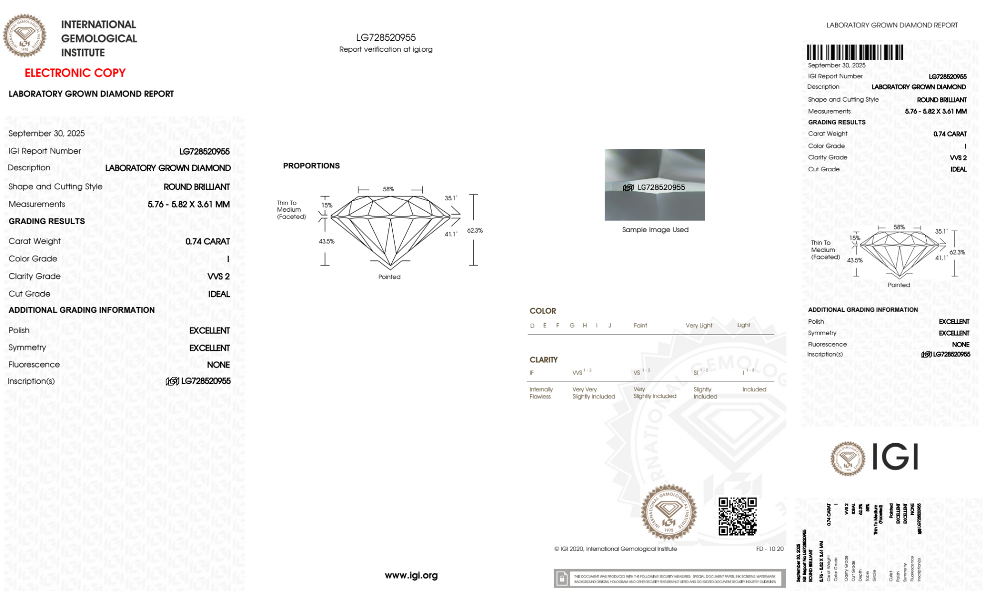 Your 0.74 carat Round lab diamond is graded I color (Near Colorless), and you can read more about I color diamonds here.