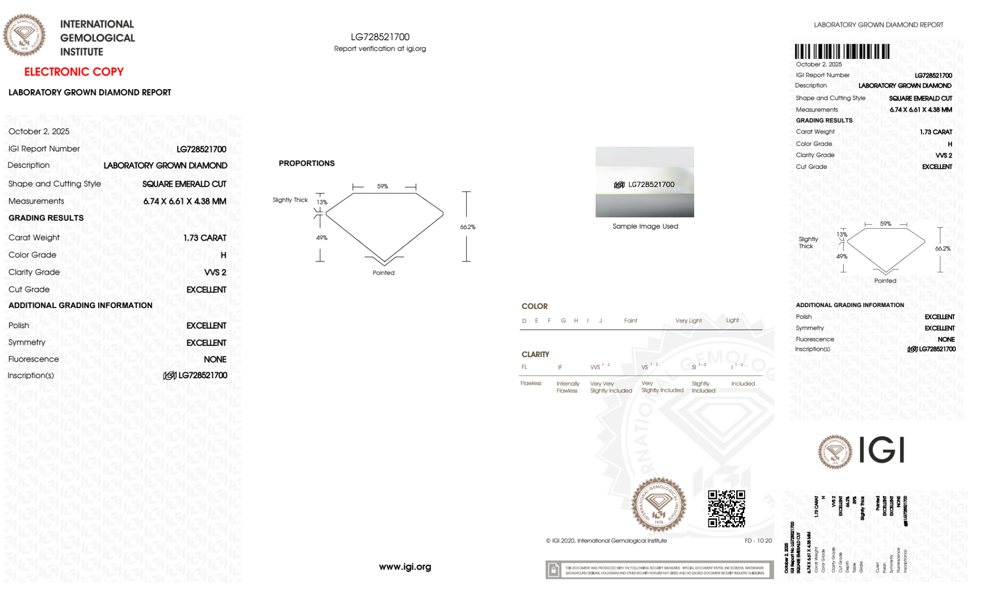 Your 1.73 carat Asscher lab diamond is graded H color (Near Colorless), and you can read more about H color diamonds here.