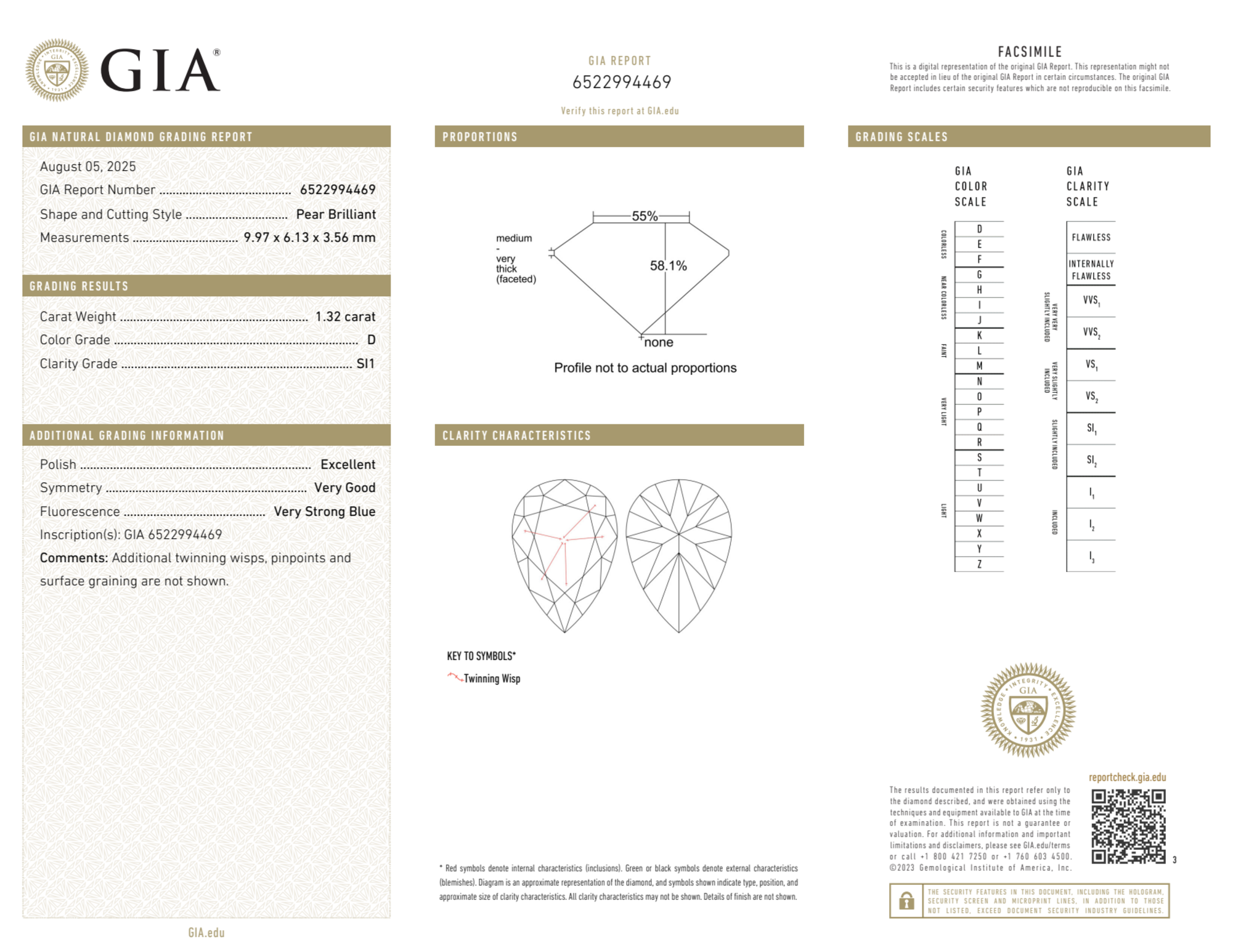 Your 1.32 carat Pear natural diamond is graded D color (Colorless), and you can read more about D color diamonds here.