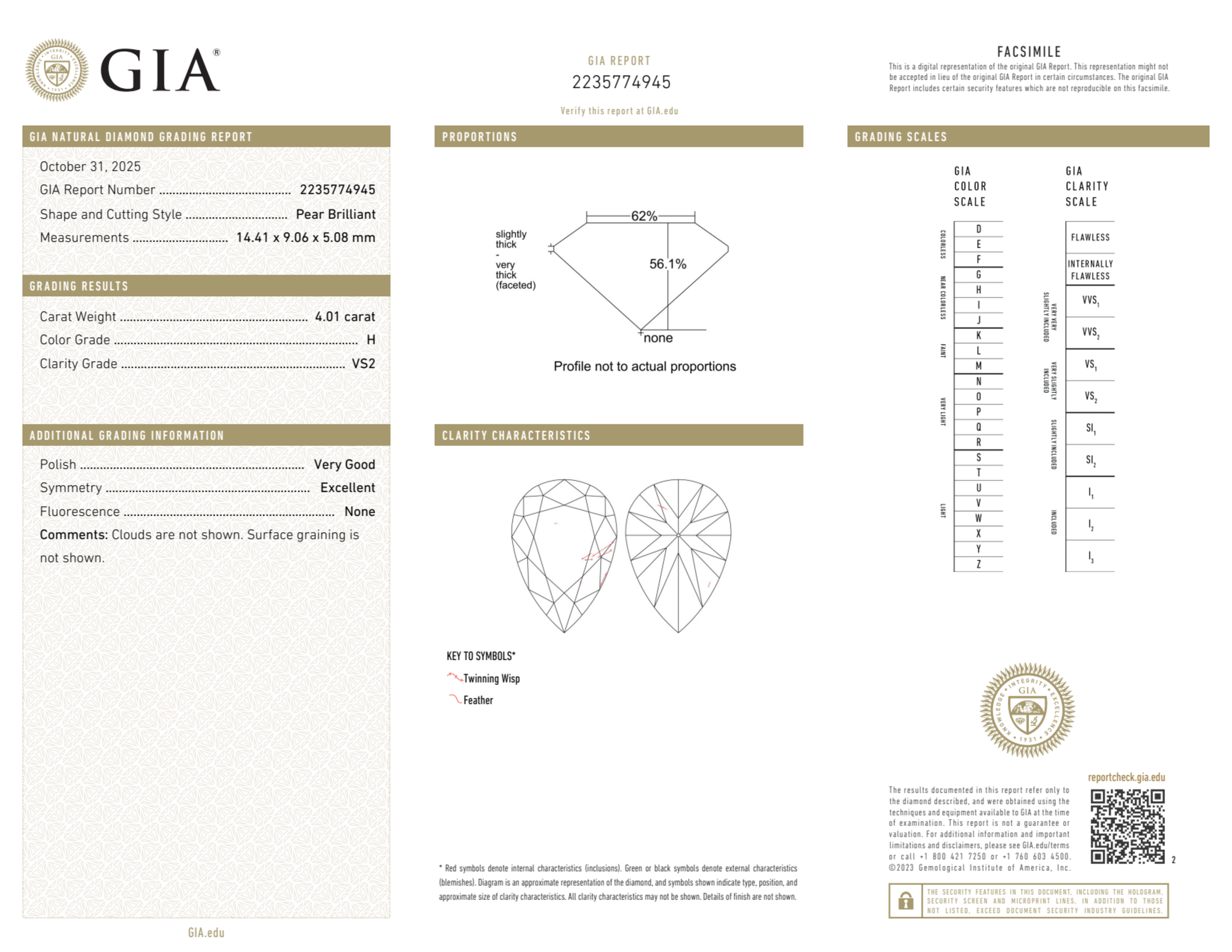 Your 4.01 carat Pear natural diamond is graded H color (Near Colorless), and you can read more about H color diamonds here.