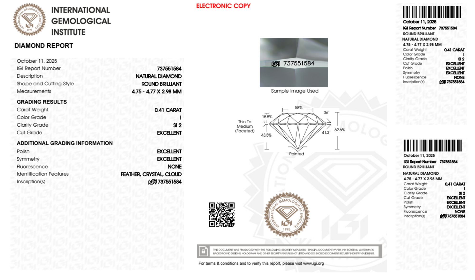 Your 0.41 carat Round natural diamond is graded SI2 clarity, which stands for Slightly Included 2. Read more about SI2 clarity diamonds here, or learn more about diamond clarity in general here.