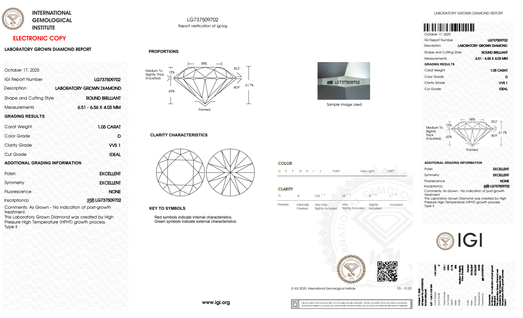 Your 1.05 carat Round lab diamond is graded D color (Colorless), and you can read more about D color diamonds here.