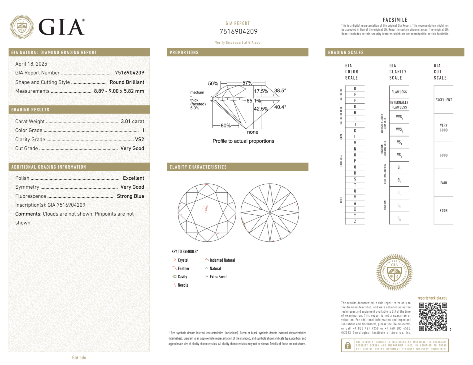 Your 3.01 carat Round natural diamond is graded VS2 clarity, which stands for Very Slightly Included 2. Read more about VS2 clarity diamonds here, or learn more about diamond clarity in general here.
