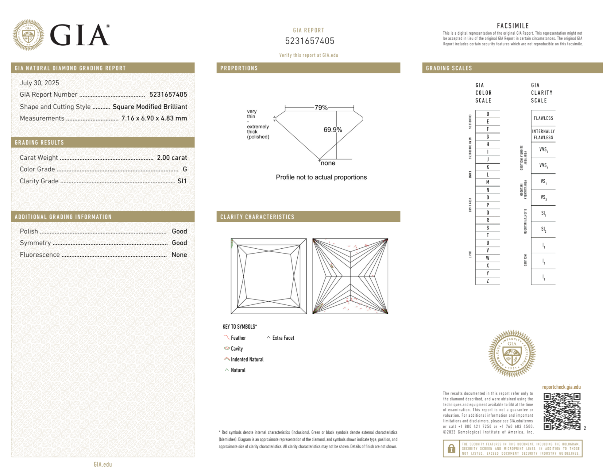 Your 2.00 carat Princess natural diamond is graded G color (Near Colorless), and you can read more about G color diamonds here.