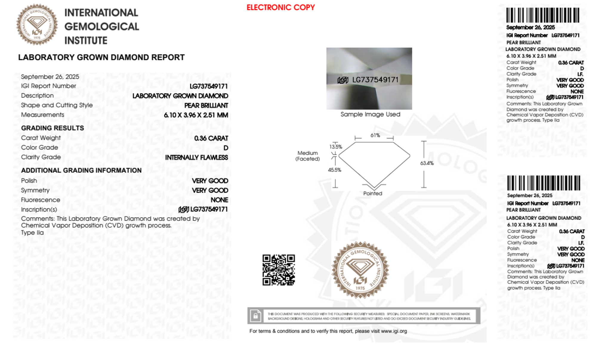 Your 0.36 carat Pear lab diamond is graded IF clarity, which stands for Internally Flawless. Read more about IF clarity diamonds here, or learn more about diamond clarity in general here.