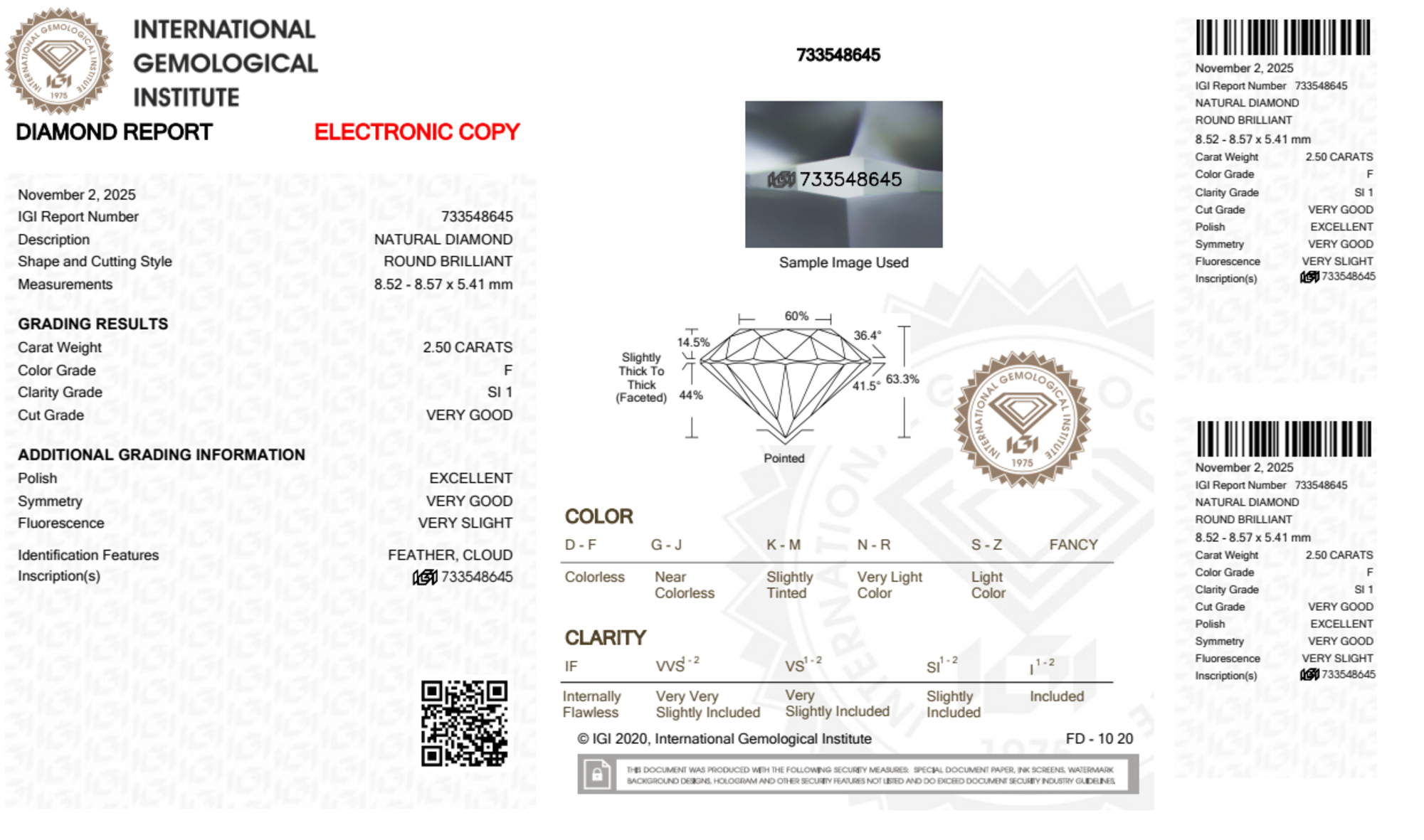 Your 2.50 carat Round natural diamond is graded F color (Colorless), and you can read more about F color diamonds here.