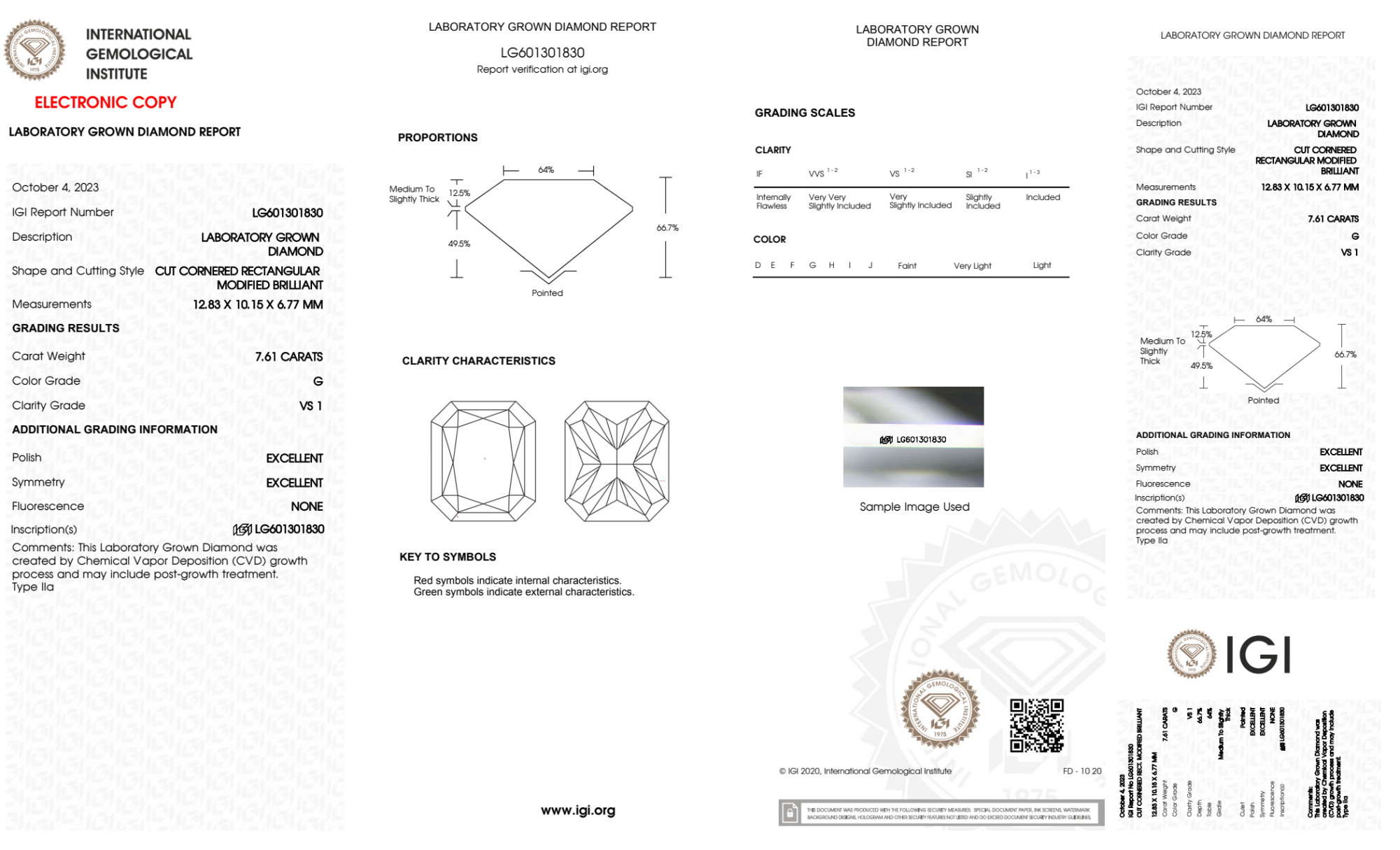 Your 7.61 carat Radiant lab diamond is graded G color (Near Colorless), and you can read more about G color diamonds here.