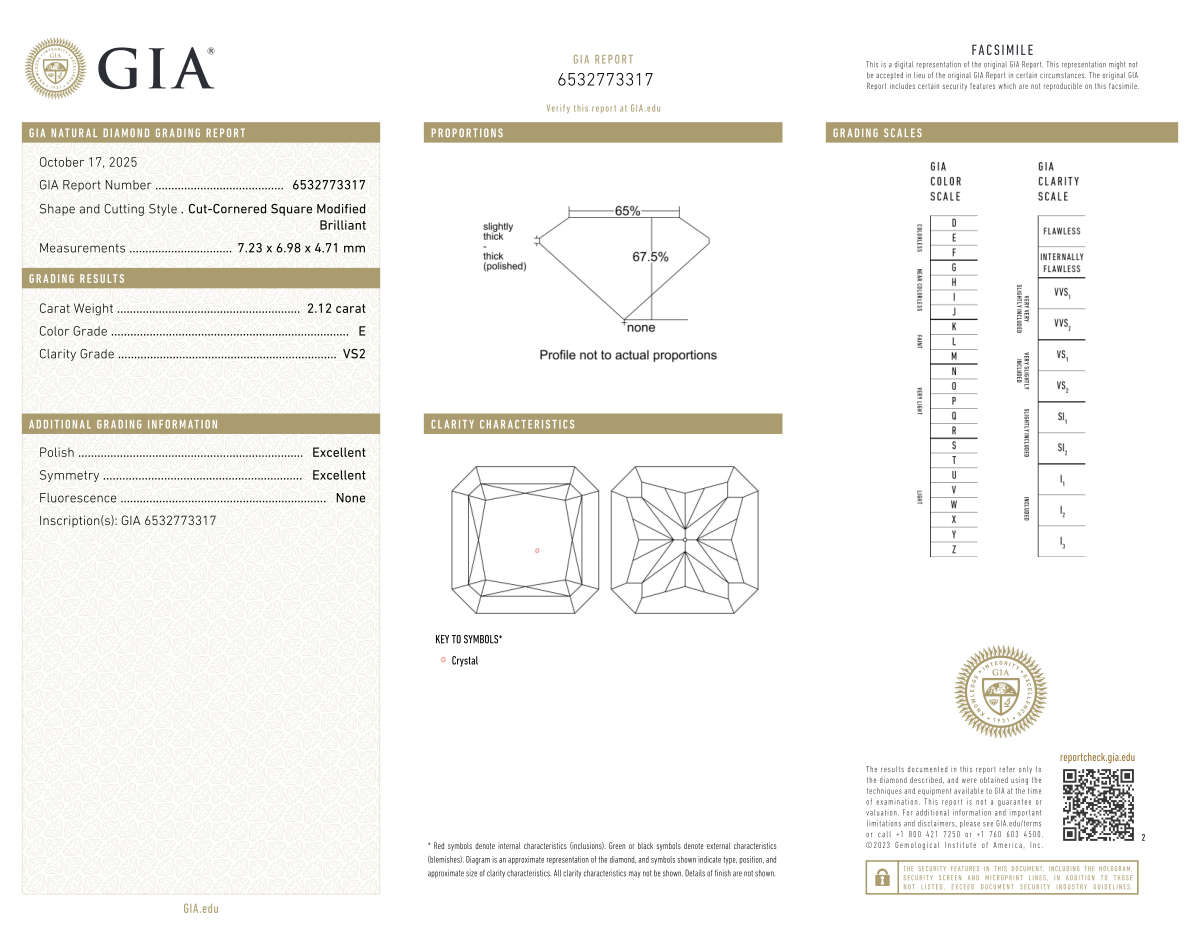 Your 2.12 carat Radiant natural diamond is graded VS2 clarity, which stands for Very Slightly Included 2. Read more about VS2 clarity diamonds here, or learn more about diamond clarity in general here.