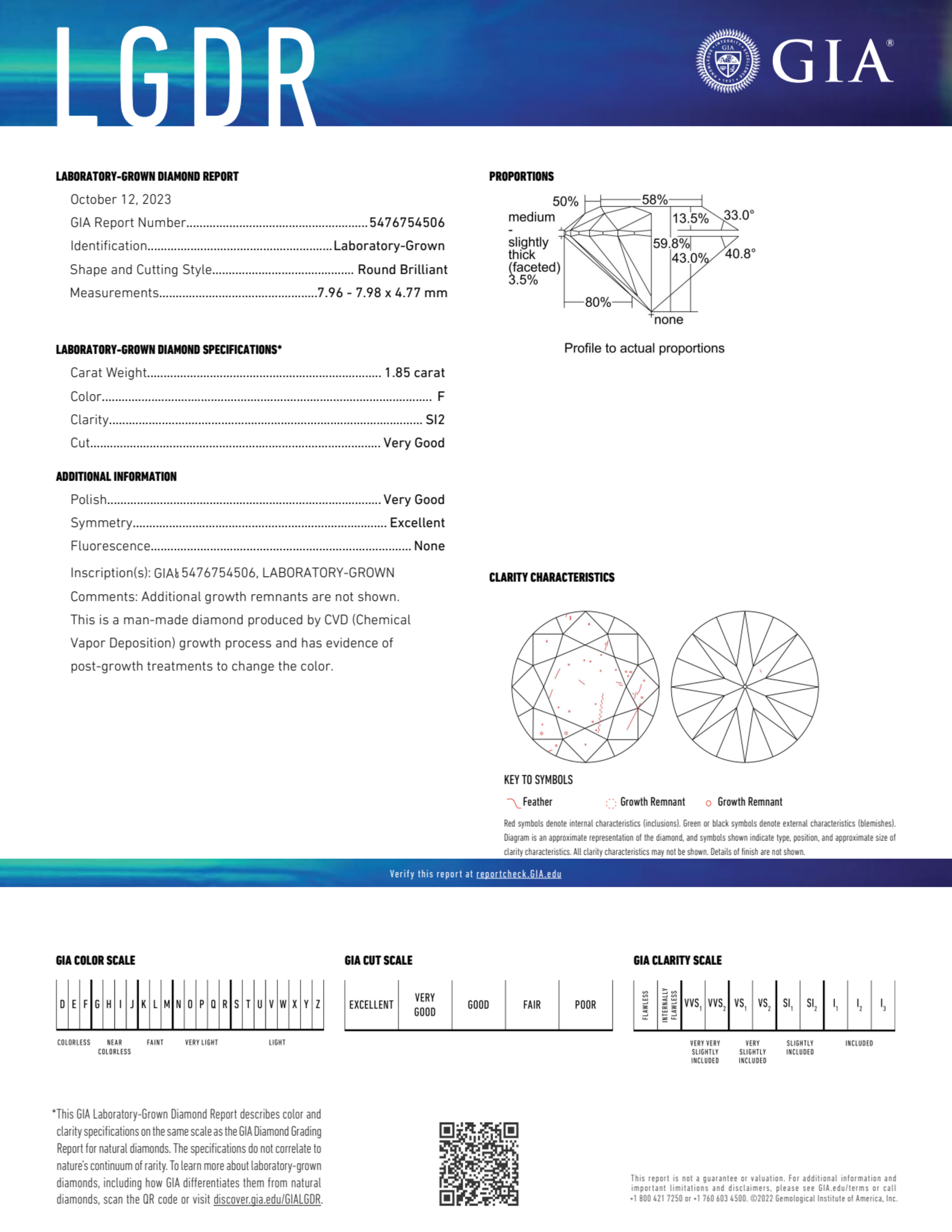 Your 1.85 carat Round lab diamond is graded F color (Colorless), and you can read more about F color diamonds here.