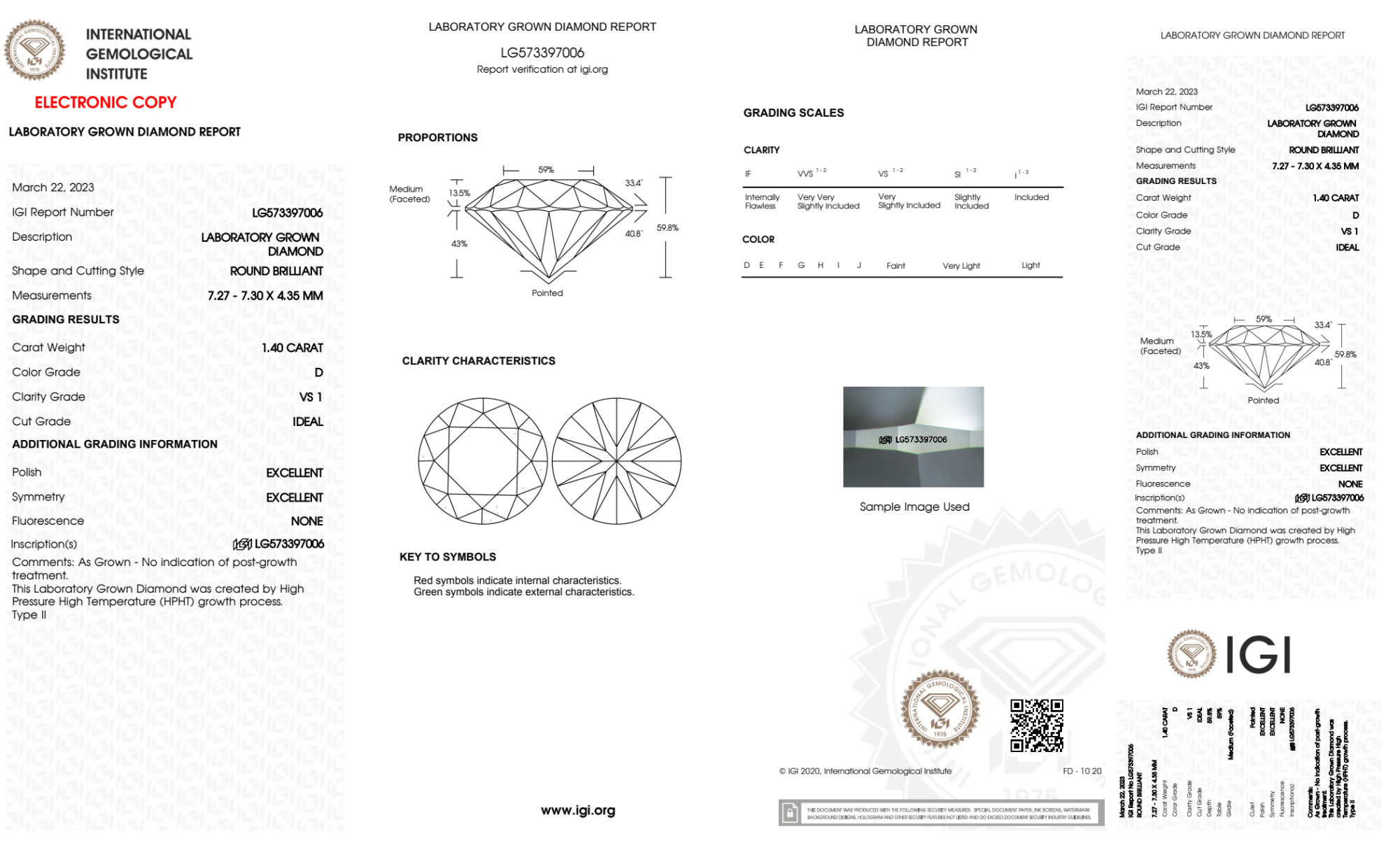 Your 1.40 carat Round lab diamond is graded D color (Colorless), and you can read more about D color diamonds here.