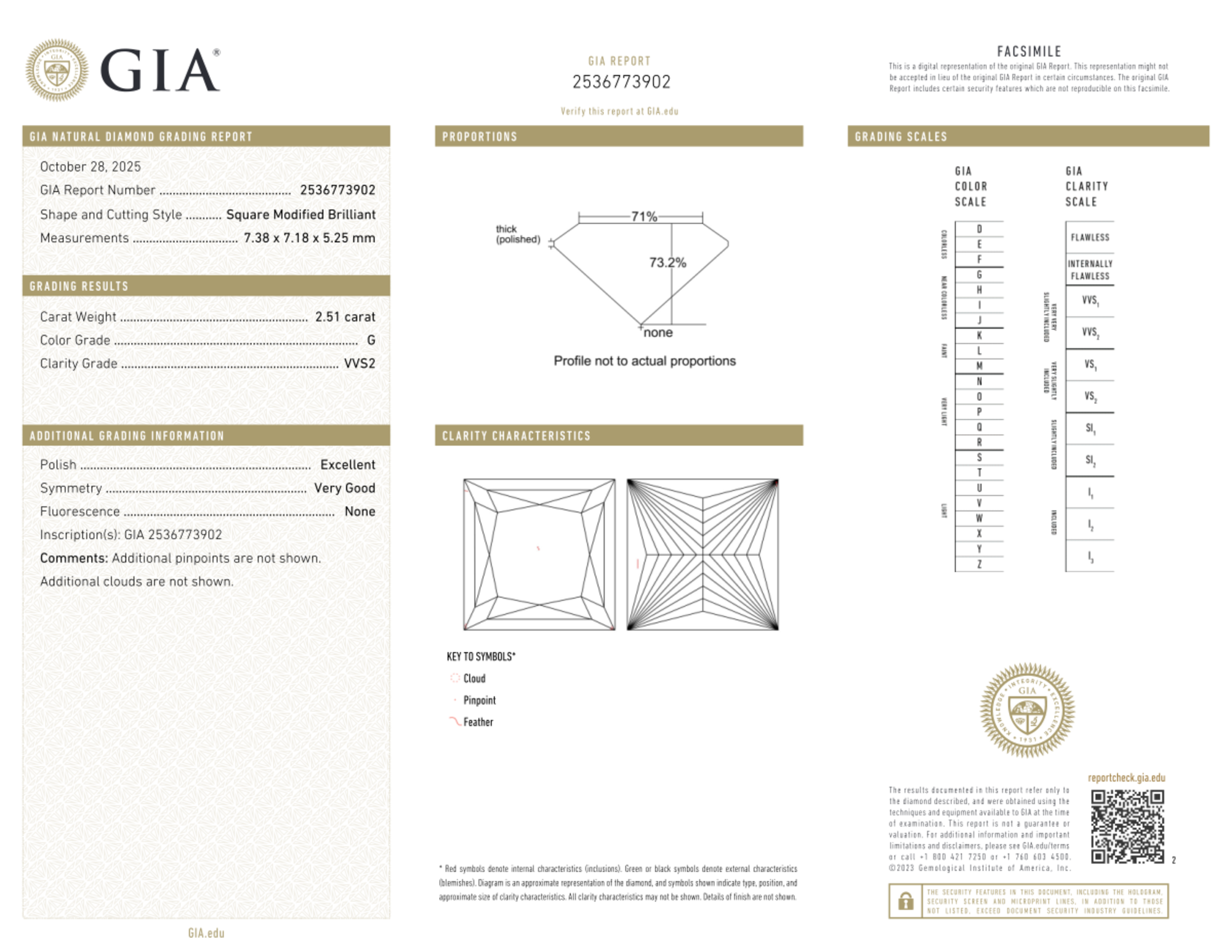 Your 2.51 carat Princess natural diamond is graded VVS2 clarity, which stands for Very Very Slightly Included 2. Read more about VVS2 clarity diamonds here, or learn more about diamond clarity in general here.