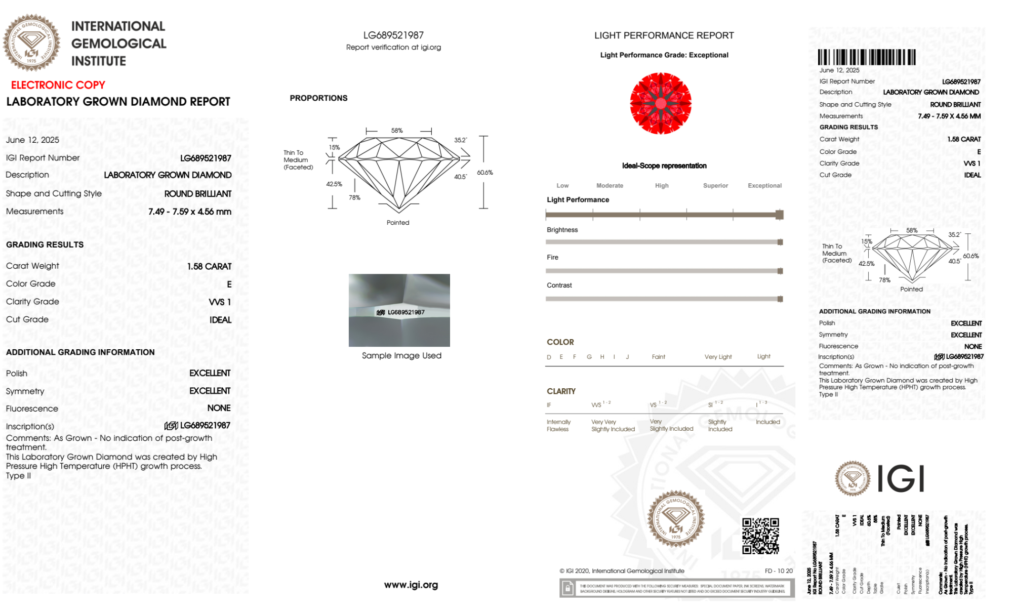 Your 1.58 carat Round lab diamond is graded E color (Colorless), and you can read more about E color diamonds here.