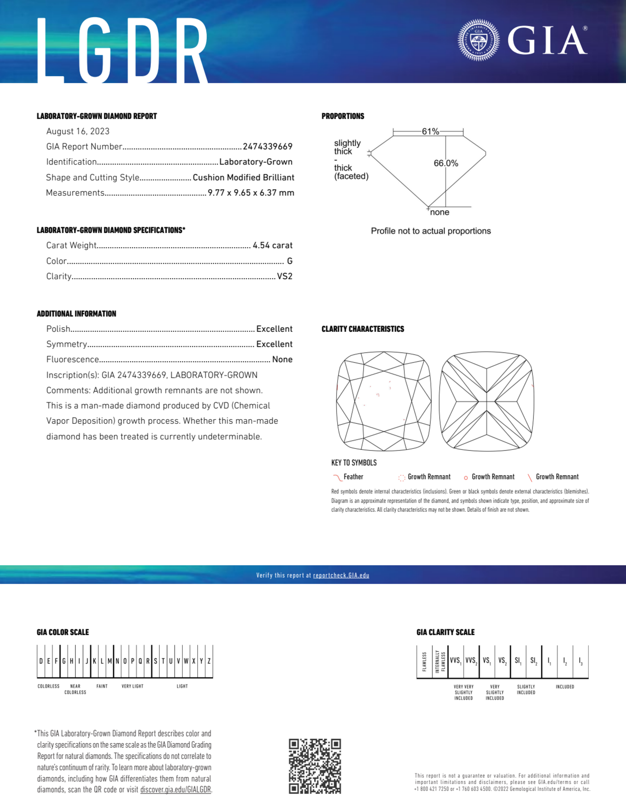 Your 4.54 carat Cushion lab diamond is graded G color (Near Colorless), and you can read more about G color diamonds here.