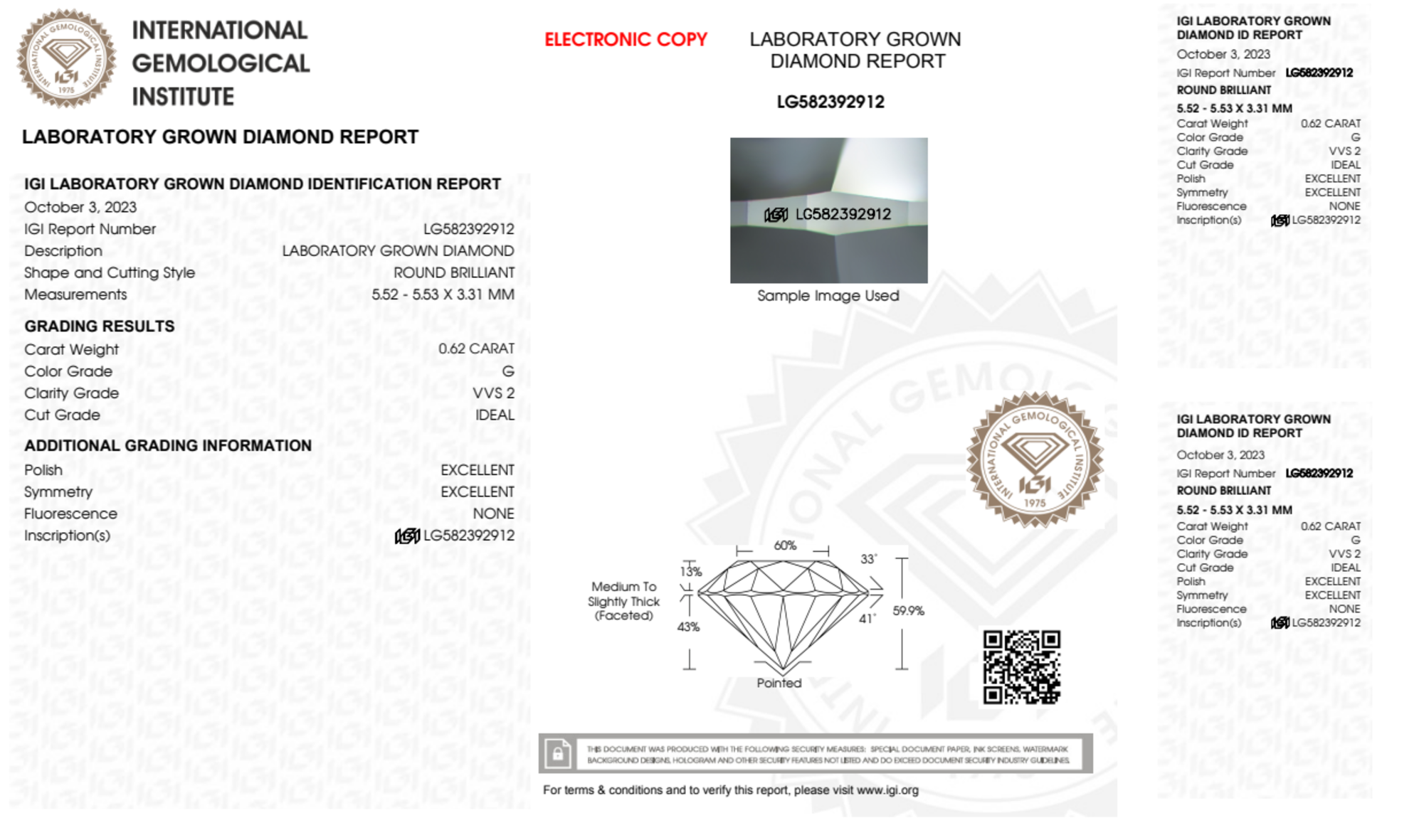 Your 0.62 carat Round lab diamond is graded G color (Near Colorless), and you can read more about G color diamonds here.
