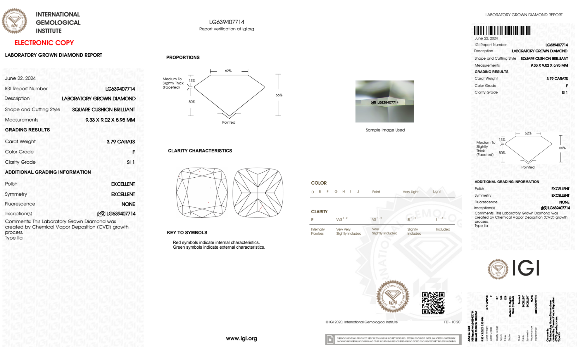Your 3.79 carat Cushion lab diamond is graded F color (Colorless), and you can read more about F color diamonds here.