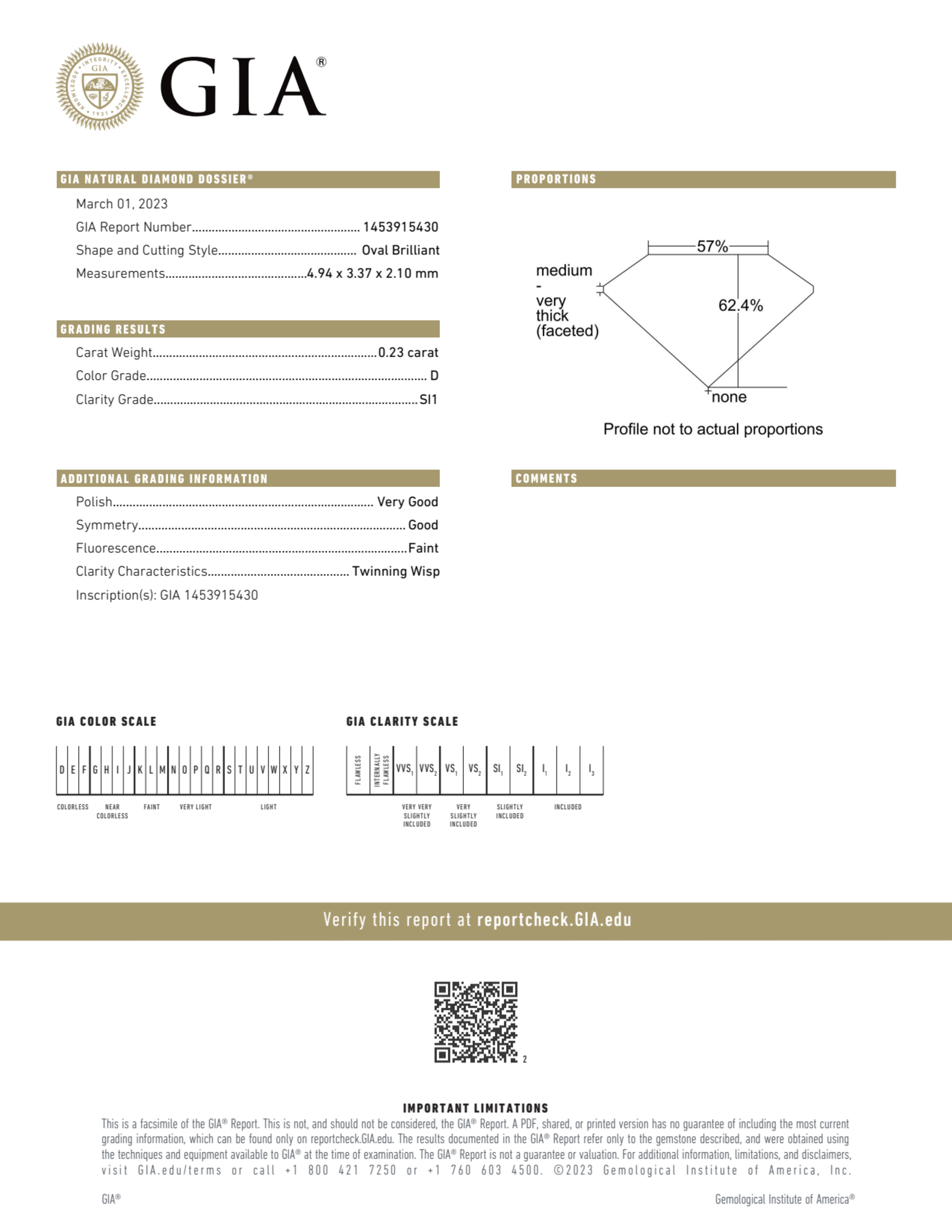 Your 0.23 carat Oval natural diamond is graded D color (Colorless), and you can read more about D color diamonds here.