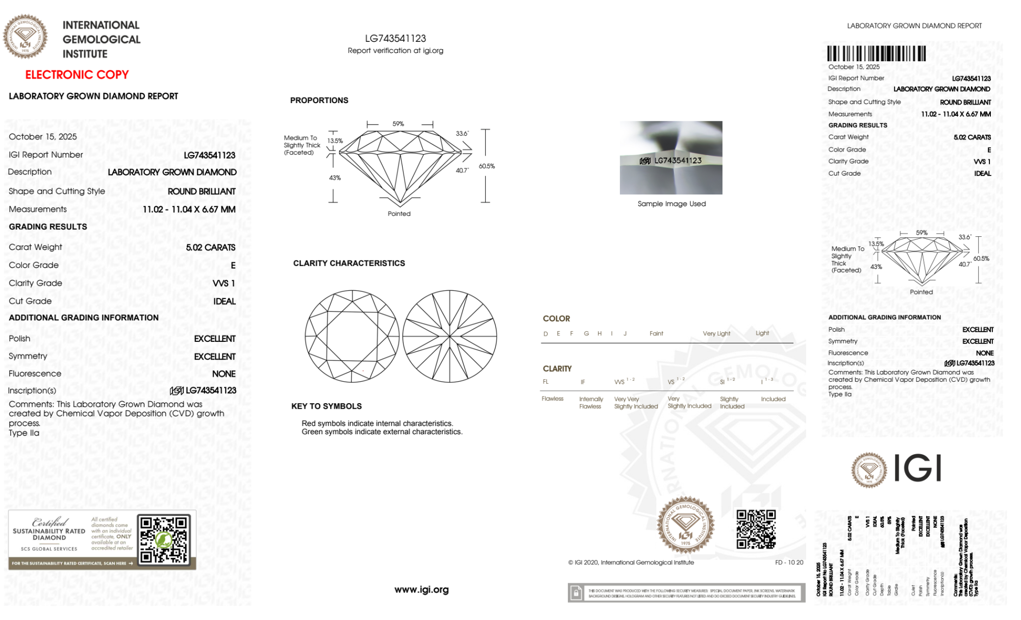 Your 5.02 carat Round lab diamond is graded E color (Colorless), and you can read more about E color diamonds here.