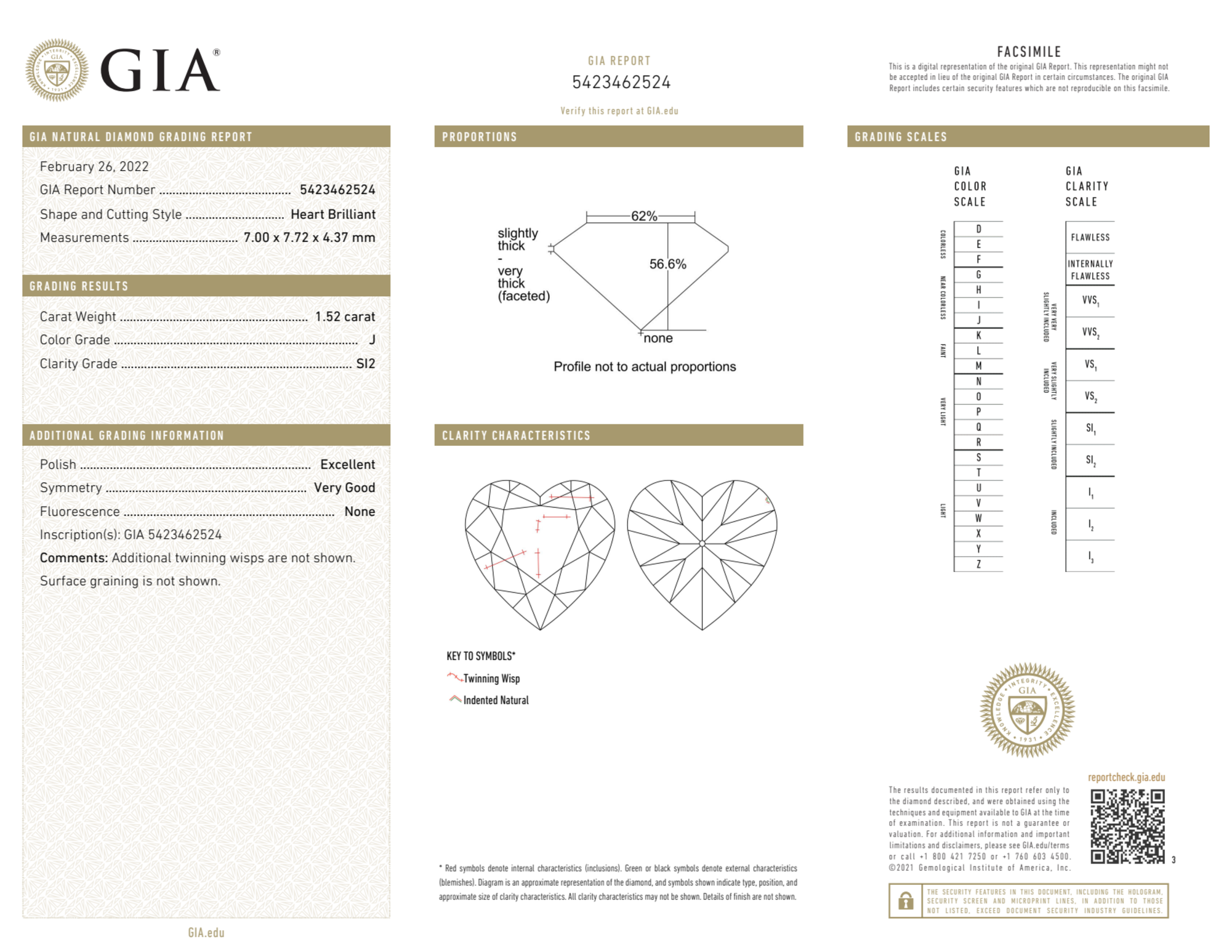 Your 1.52 carat Heart natural diamond is graded J color (Near Colorless), and you can read more about J color diamonds here.