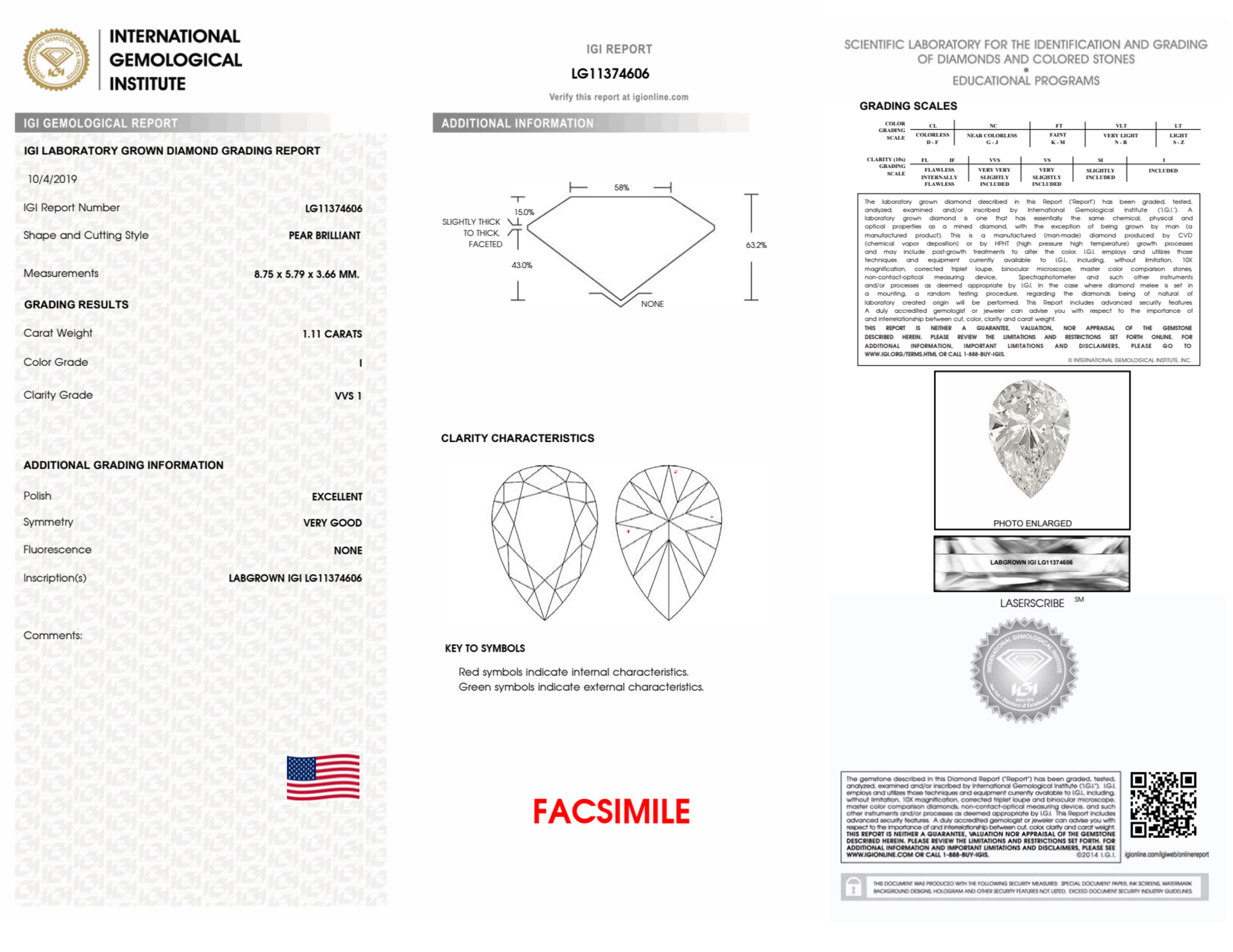 Your 1.11 carat Pear lab diamond is graded VVS1 clarity, which stands for Very Very Slightly Included 1. Read more about VVS1 clarity diamonds here, or learn more about diamond clarity in general here.