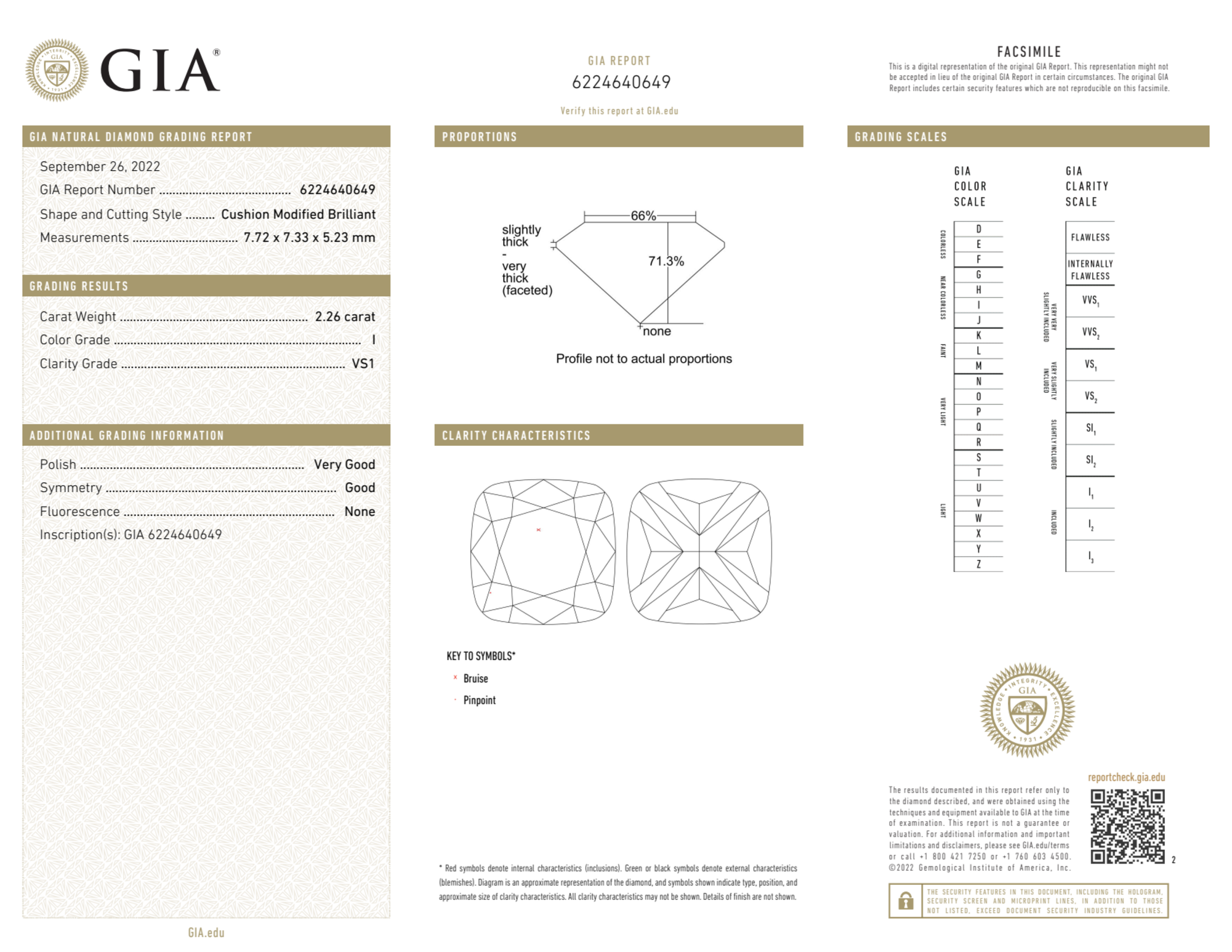 Your 2.26 carat Cushion natural diamond is graded VS1 clarity, which stands for Very Slightly Included 1. Read more about VS1 clarity diamonds here, or learn more about diamond clarity in general here.