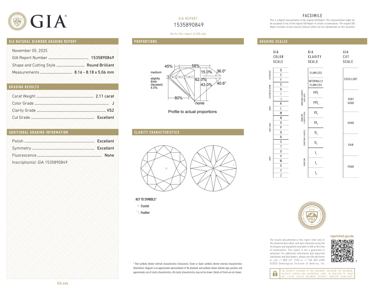 Your 2.11 carat Round natural diamond is graded J color (Near Colorless), and you can read more about J color diamonds here.