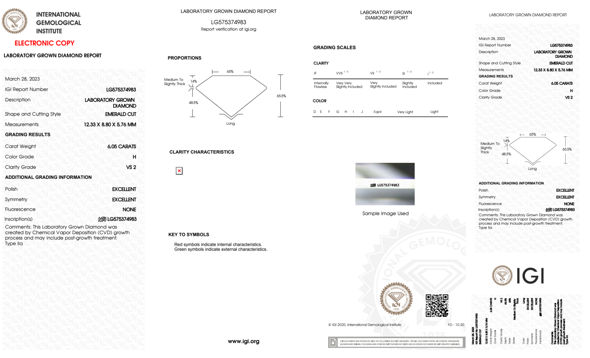 Your 6.05 carat Emerald lab diamond is graded VS2 clarity, which stands for Very Slightly Included 2. Read more about VS2 clarity diamonds here, or learn more about diamond clarity in general here.