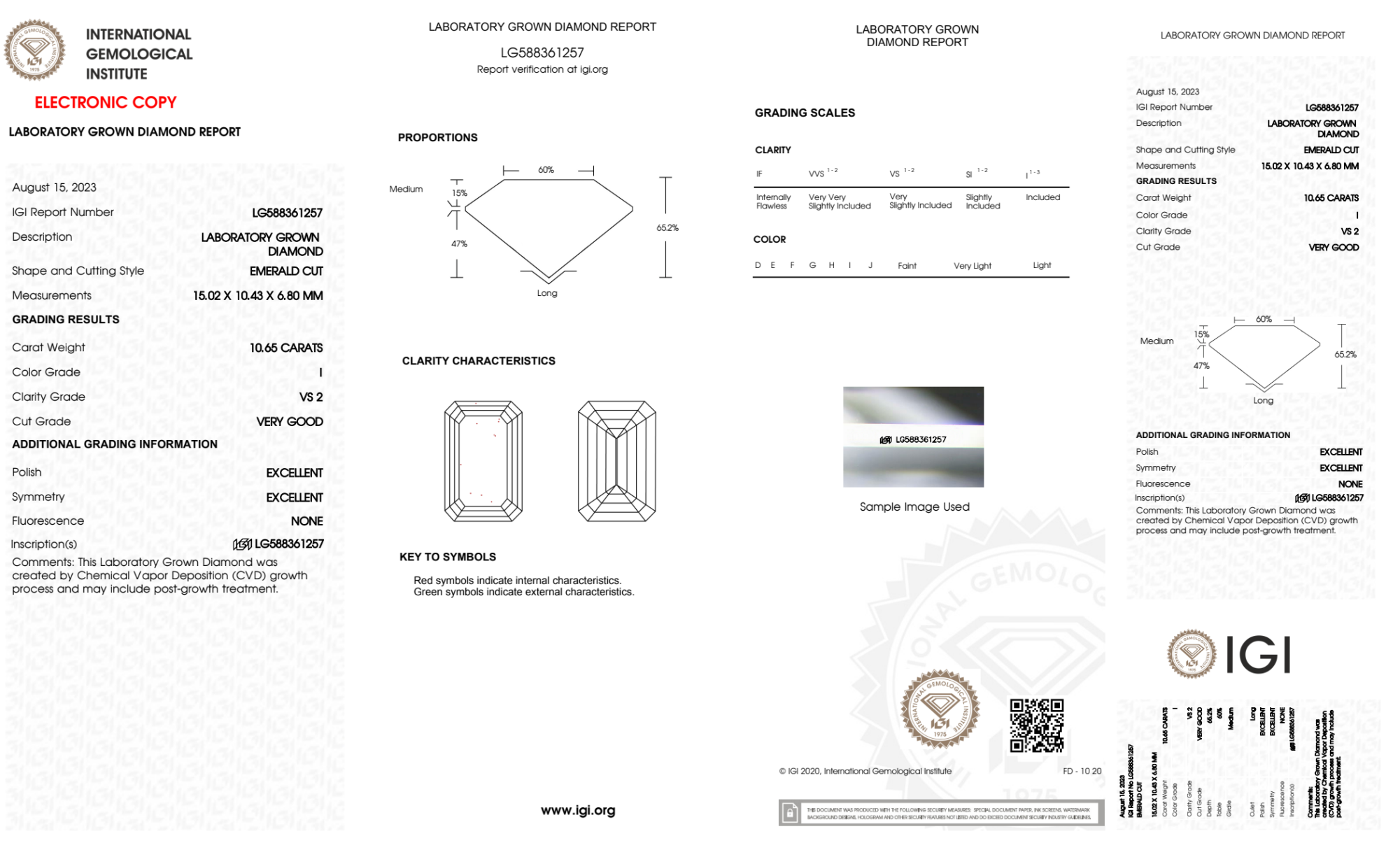 Your 10.65 carat Emerald lab diamond is graded VS2 clarity, which stands for Very Slightly Included 2. Read more about VS2 clarity diamonds here, or learn more about diamond clarity in general here.