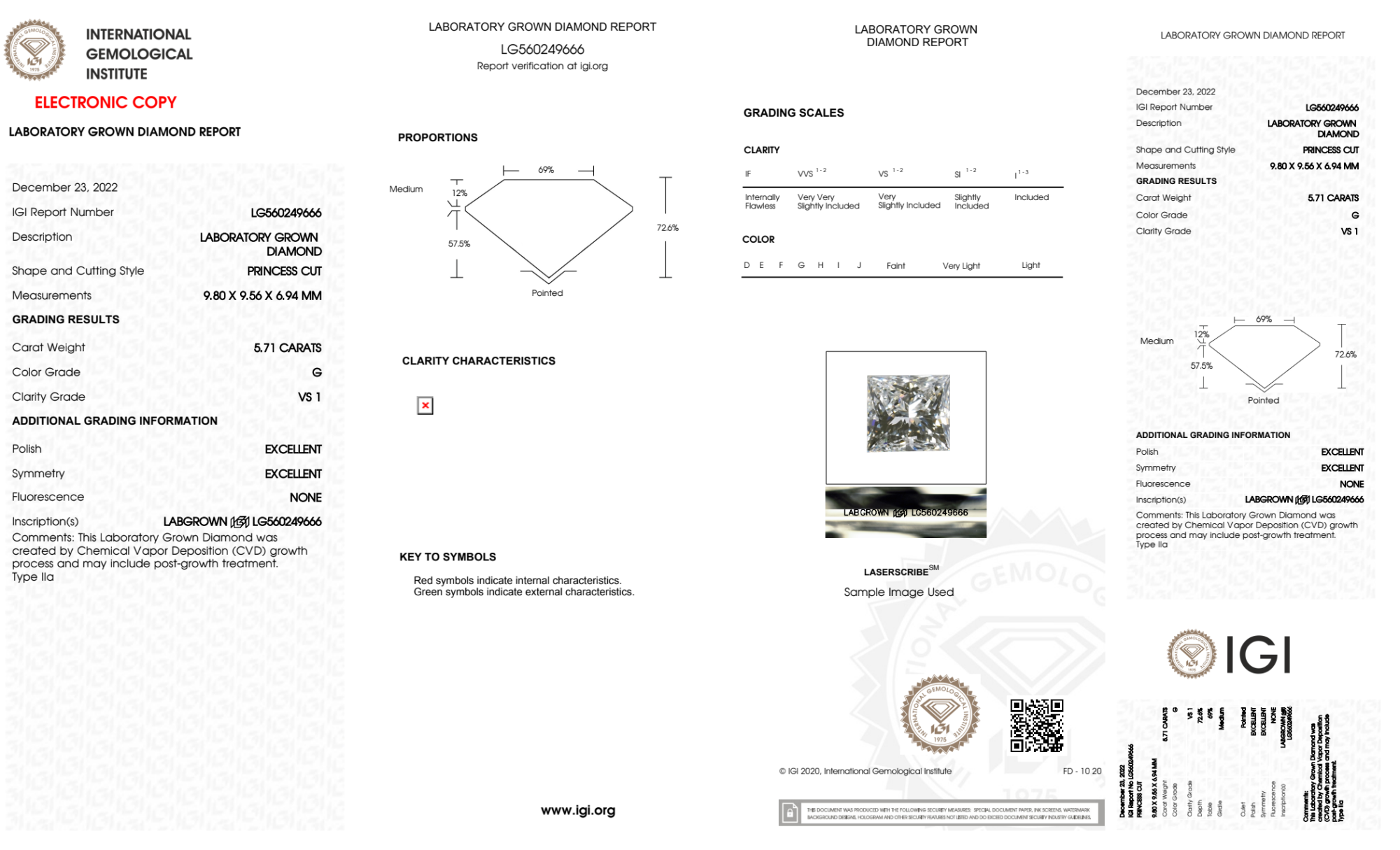 Your 5.71 carat Princess lab diamond is graded G color (Near Colorless), and you can read more about G color diamonds here.