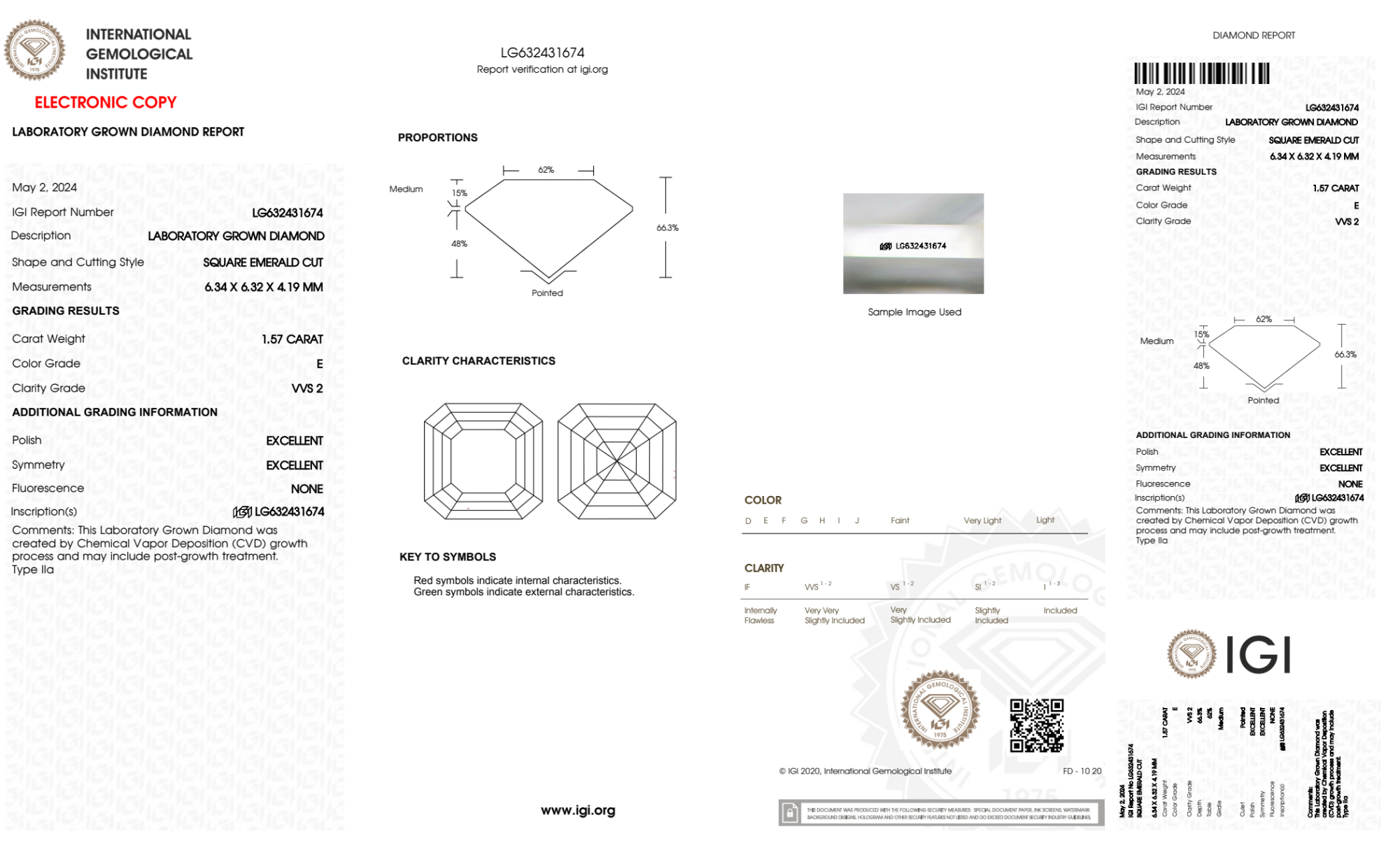 Your 1.57 carat Asscher lab diamond is graded E color (Colorless), and you can read more about E color diamonds here.