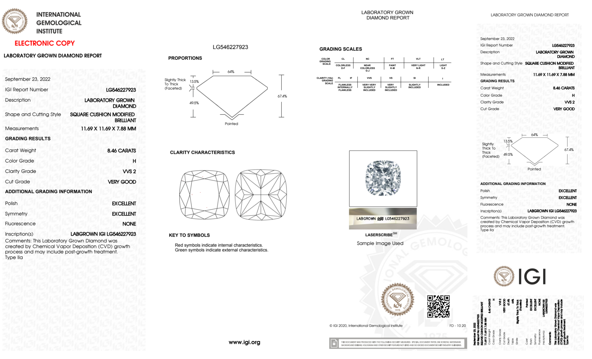 Your 8.46 carat Cushion lab diamond is graded H color (Near Colorless), and you can read more about H color diamonds here.