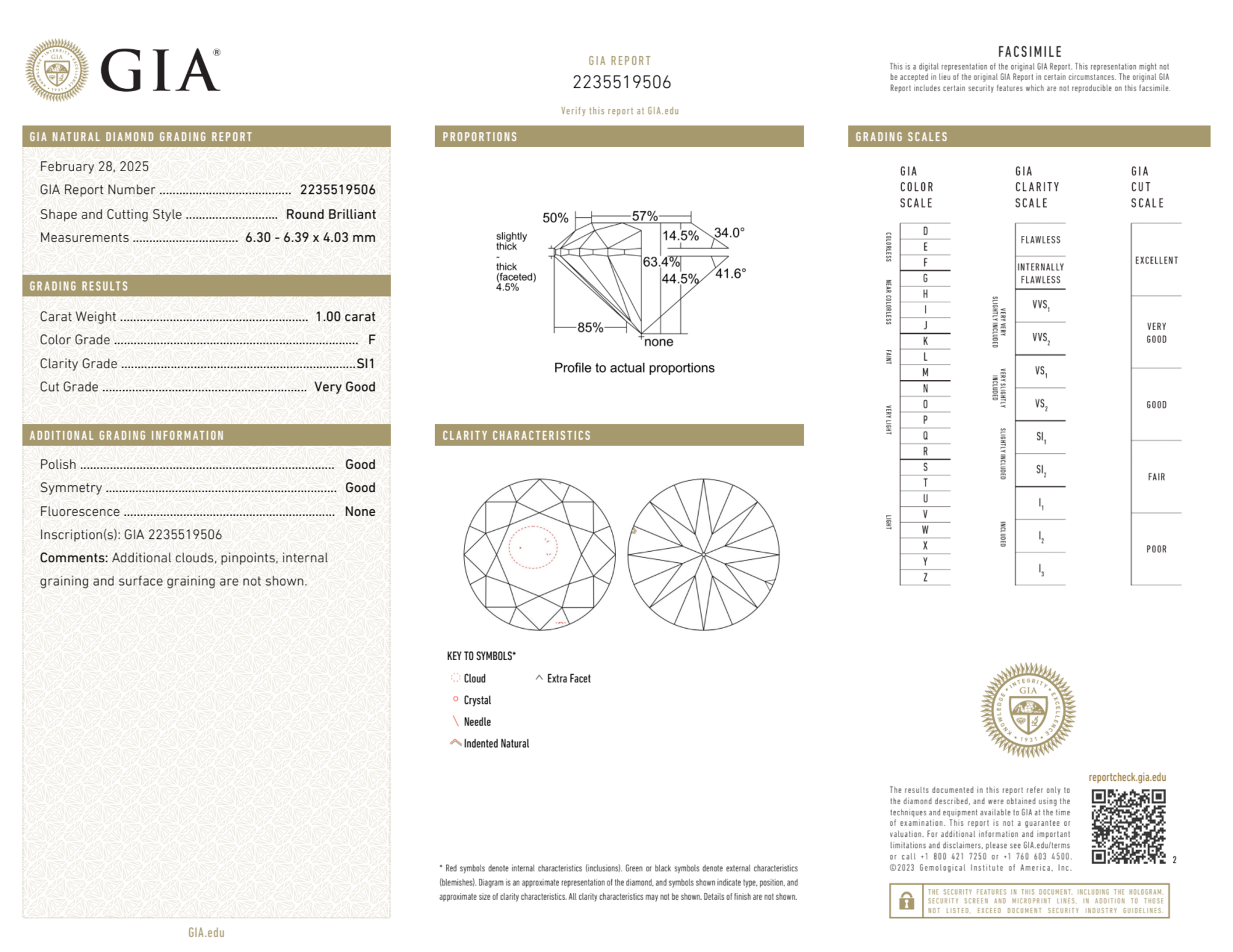 Your 1.00 carat Round natural diamond is graded SI1 clarity, which stands for Slightly Included 1. Read more about SI1 clarity diamonds here, or learn more about diamond clarity in general here.