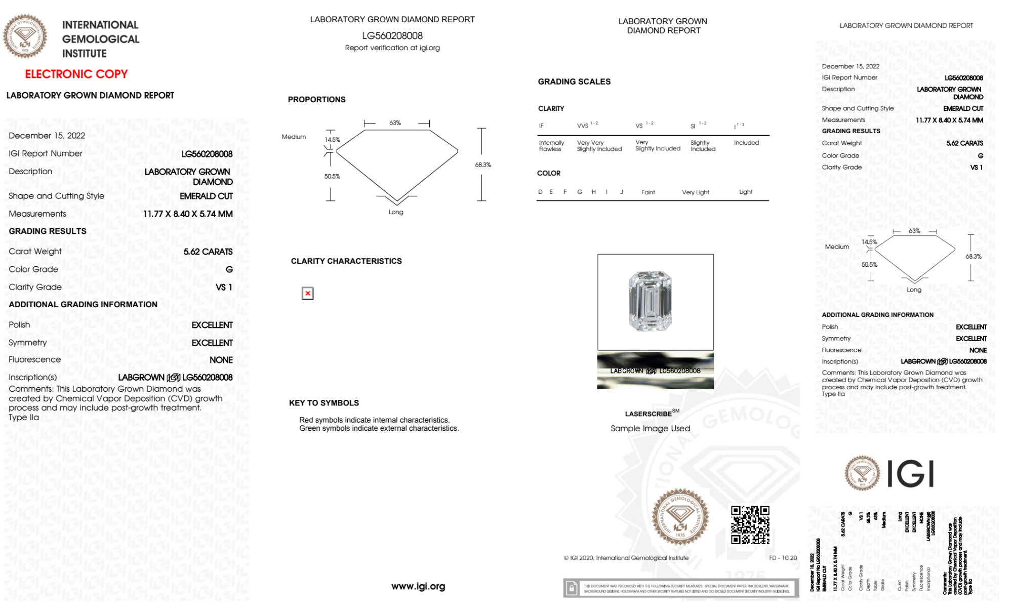 Your 5.62 carat Emerald lab diamond is graded G color (Near Colorless), and you can read more about G color diamonds here.