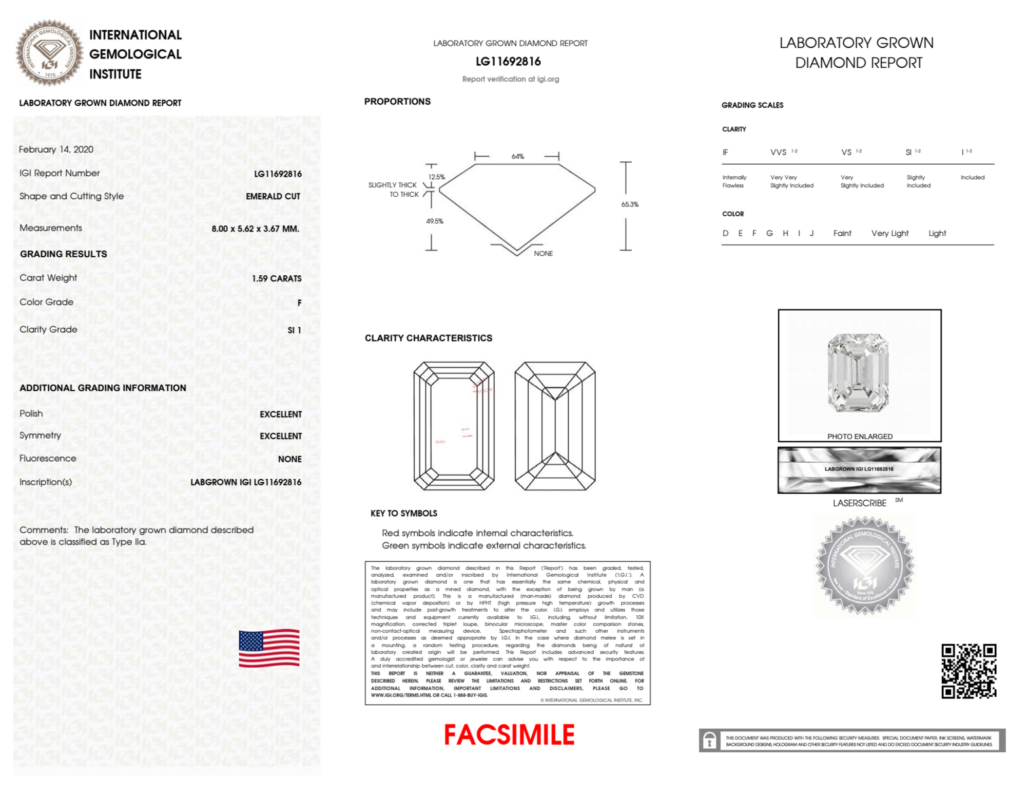 Your 1.59 carat Emerald lab diamond is graded F color (Colorless), and you can read more about F color diamonds here.
