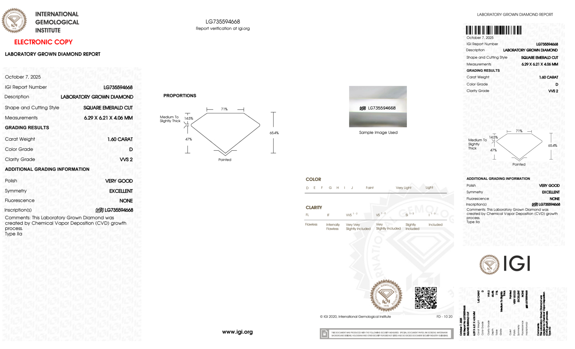 Your 1.60 carat Asscher lab diamond is graded D color (Colorless), and you can read more about D color diamonds here.