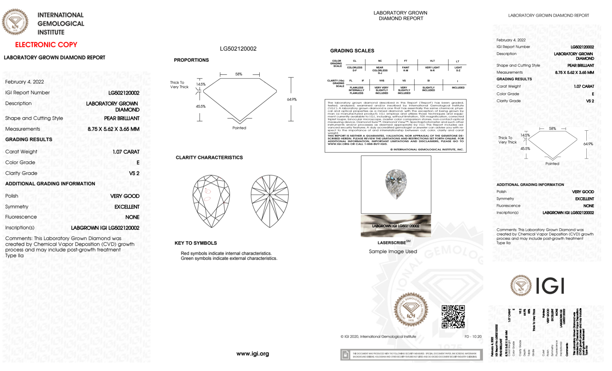 Your 1.07 carat Pear lab diamond is graded E color (Colorless), and you can read more about E color diamonds here.