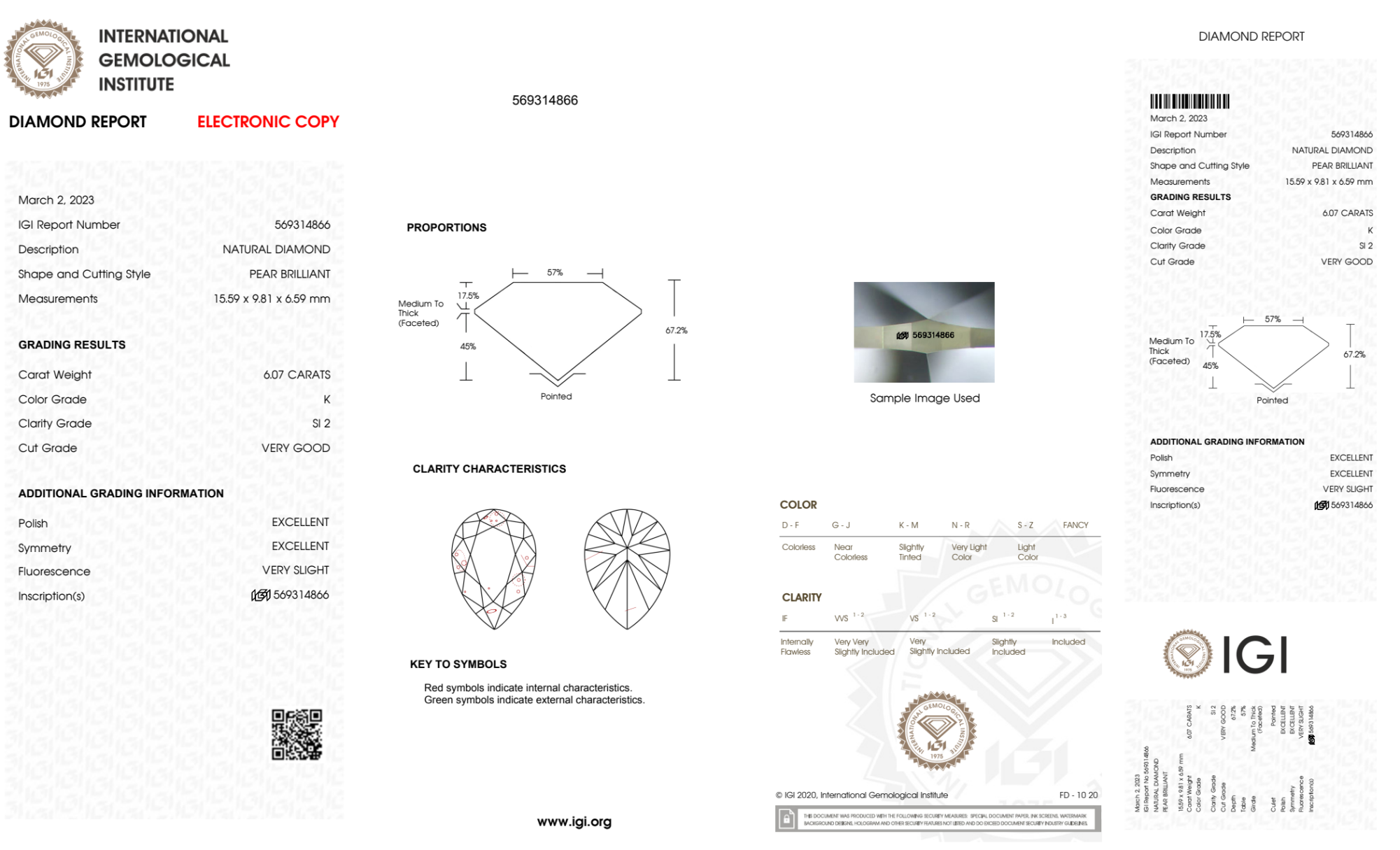 Your 6.07 carat Pear natural diamond is graded SI2 clarity, which stands for Slightly Included 2. Read more about SI2 clarity diamonds here, or learn more about diamond clarity in general here.
