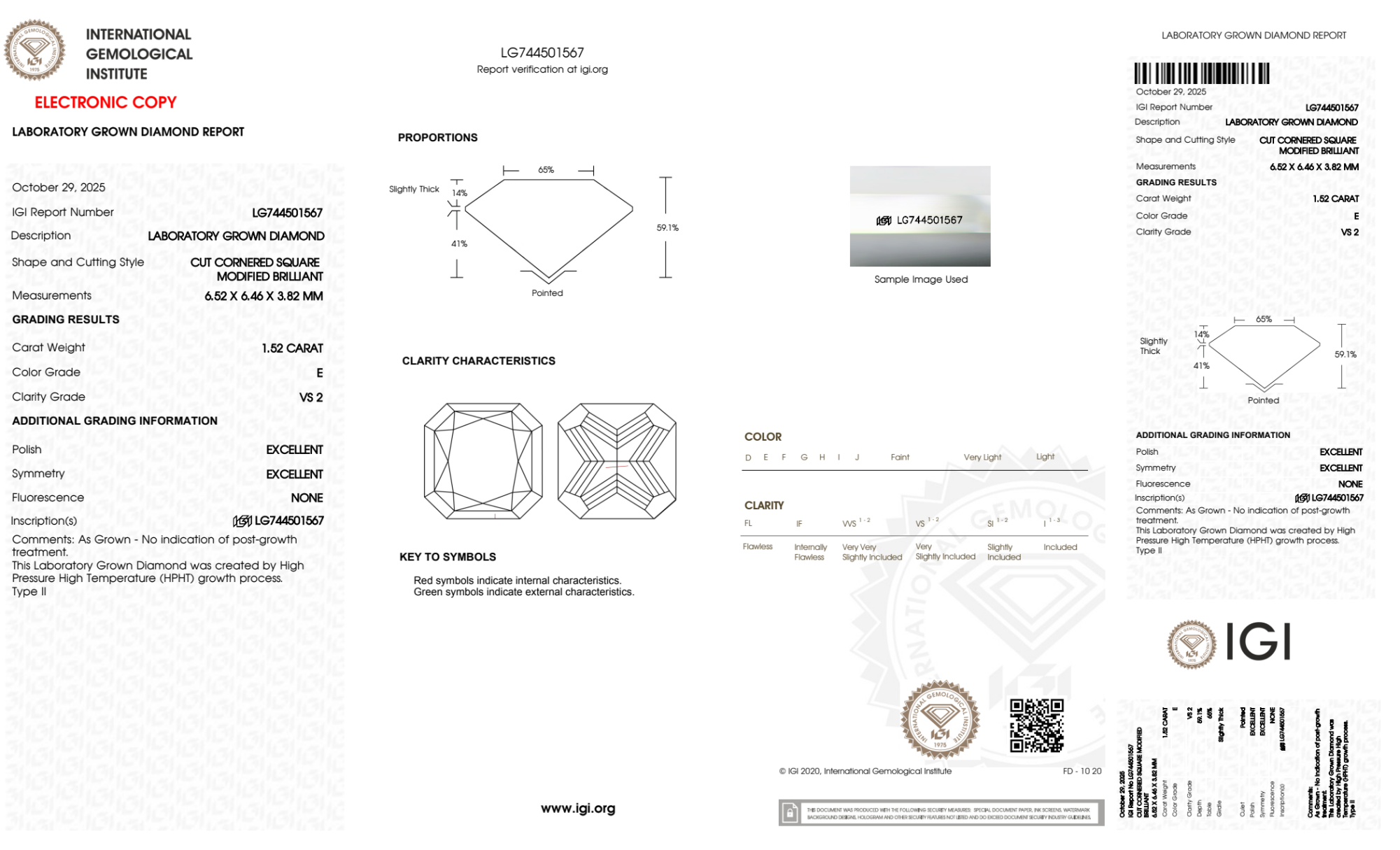 Your 1.52 carat Radiant lab diamond is graded E color (Colorless), and you can read more about E color diamonds here.