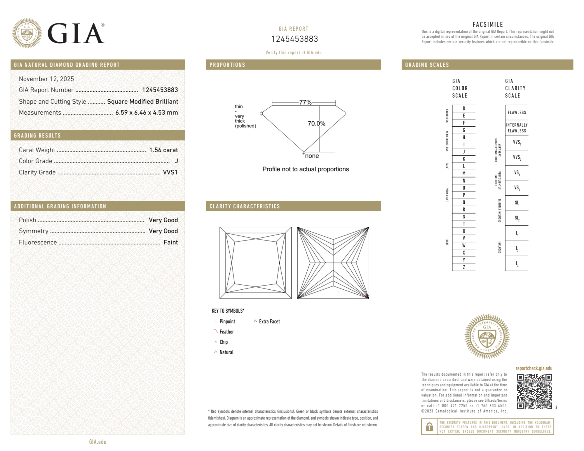 Your 1.56 carat Princess natural diamond is graded VVS1 clarity, which stands for Very Very Slightly Included 1. Read more about VVS1 clarity diamonds here, or learn more about diamond clarity in general here.