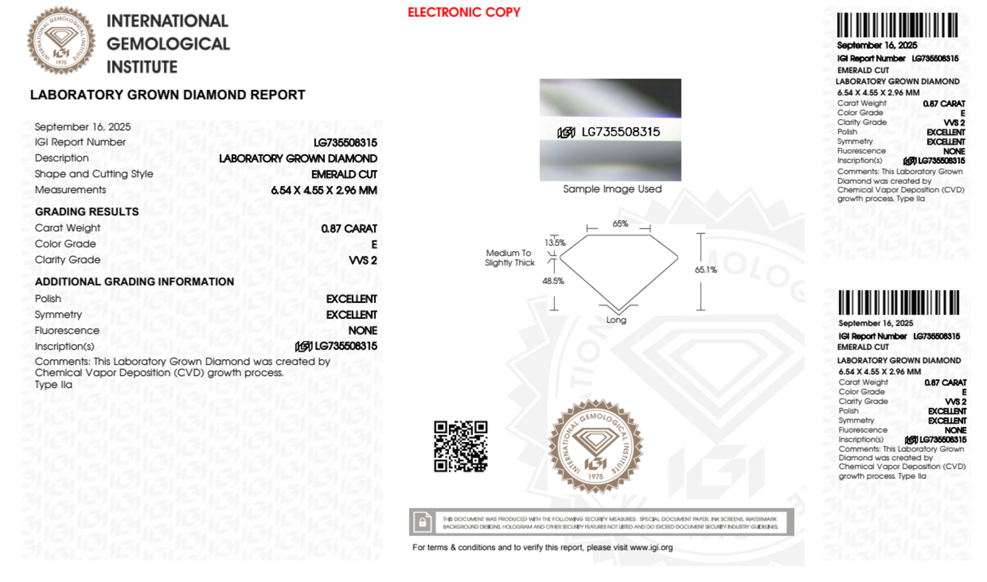Your 0.87 carat Emerald lab diamond is graded E color (Colorless), and you can read more about E color diamonds here.