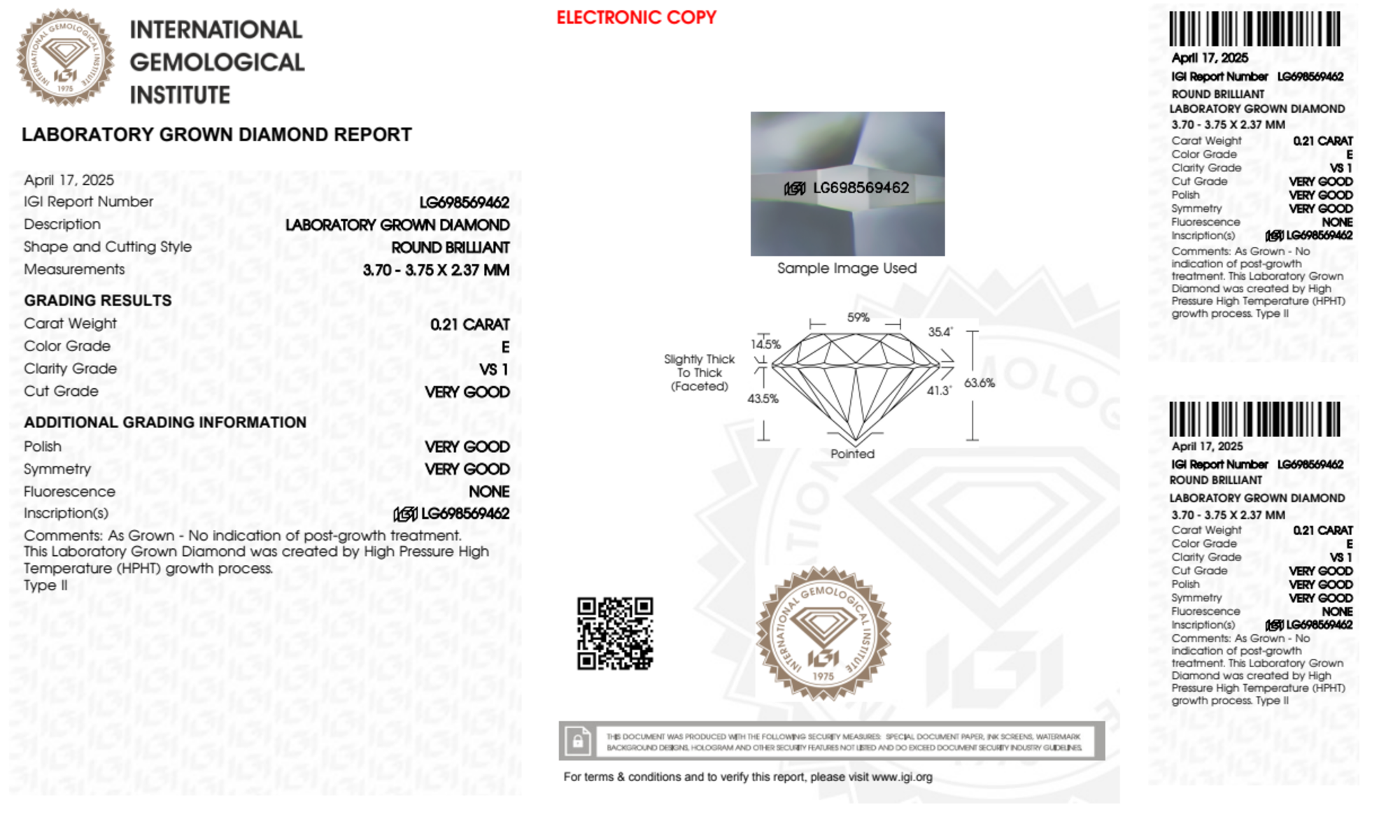 Your 0.21 carat Round lab diamond is graded E color (Colorless), and you can read more about E color diamonds here.