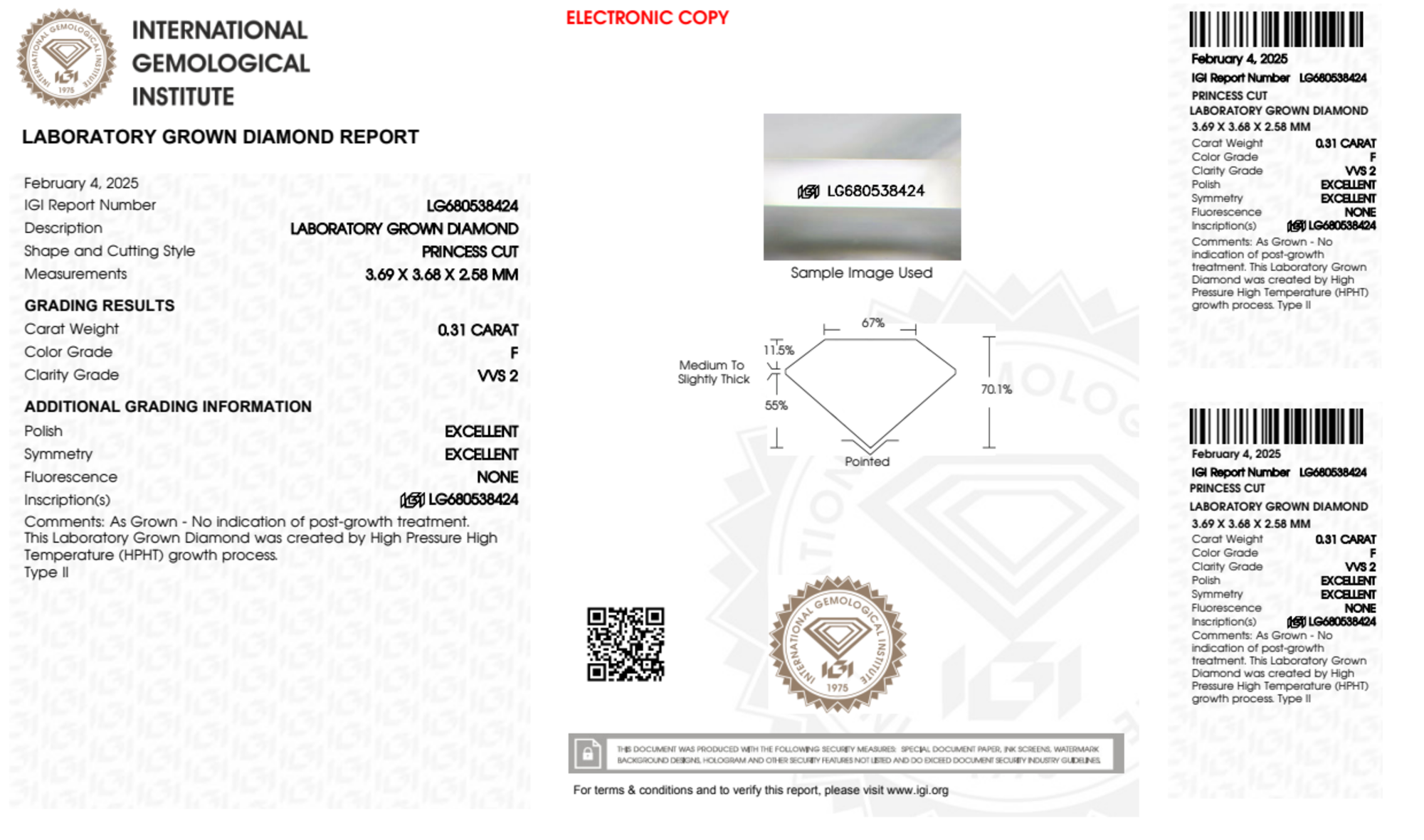 Your 0.31 carat Princess lab diamond is graded F color (Colorless), and you can read more about F color diamonds here.