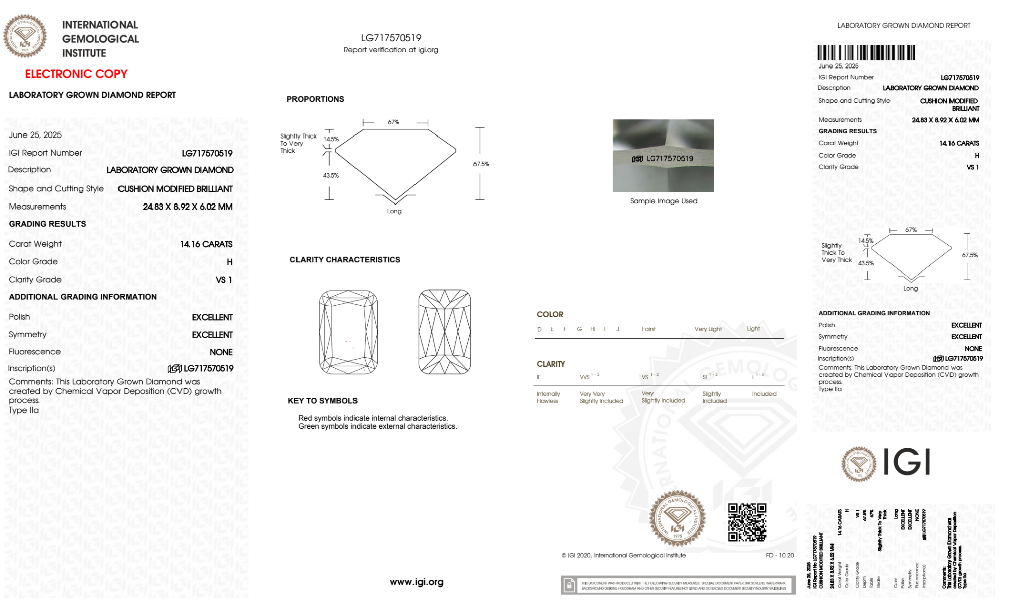 Your 14.16 carat Cushion lab diamond is graded VS1 clarity, which stands for Very Slightly Included 1. Read more about VS1 clarity diamonds here, or learn more about diamond clarity in general here.