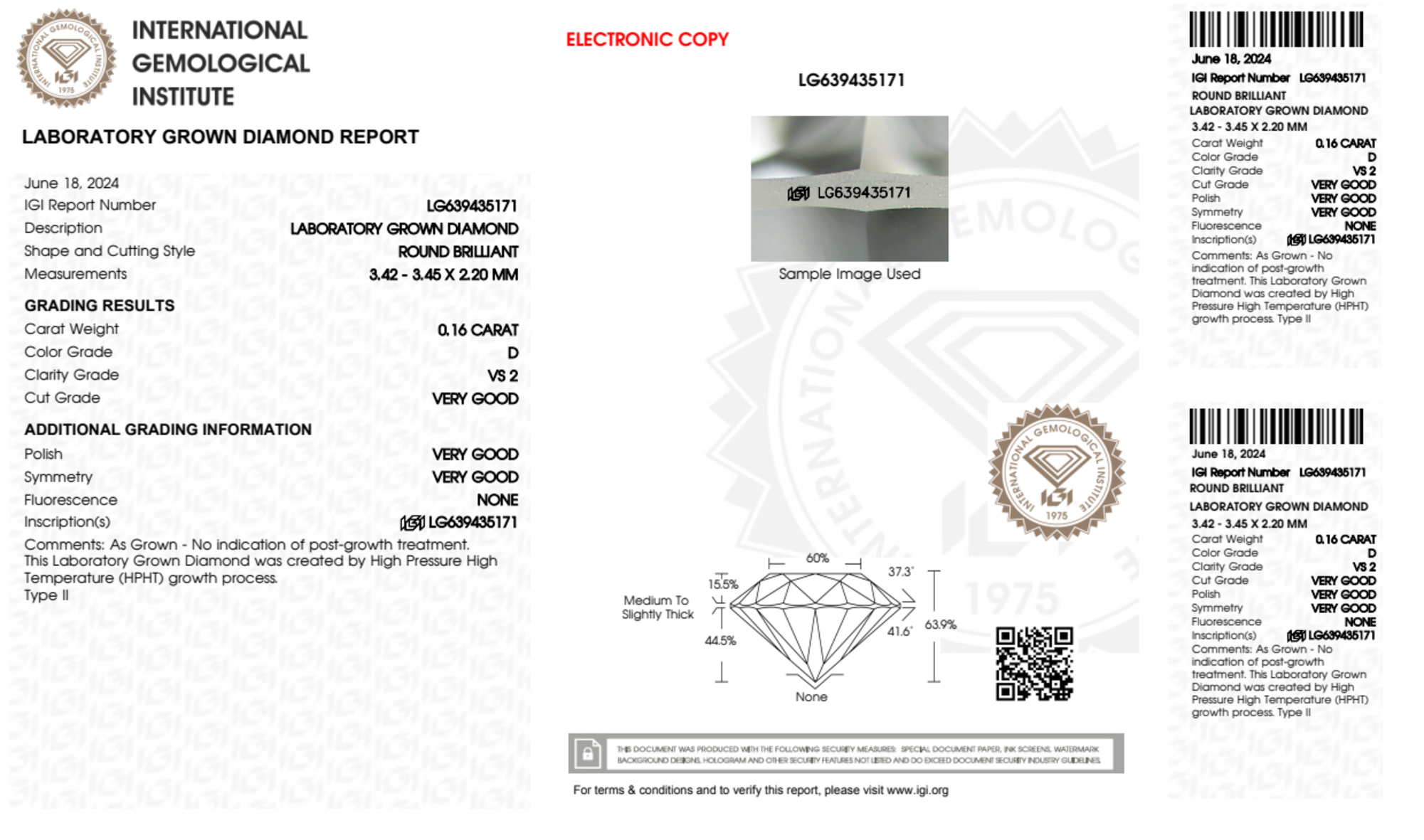 Your 0.16 carat Round lab diamond is graded D color (Colorless), and you can read more about D color diamonds here.
