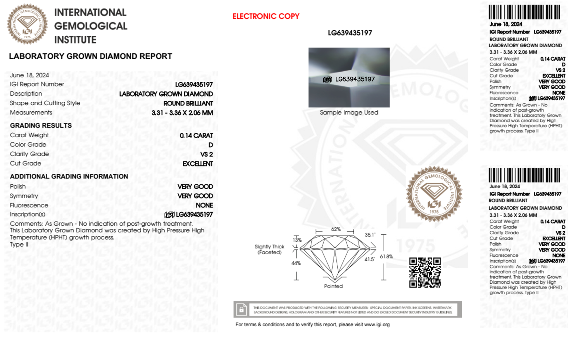 Your 0.14 carat Round lab diamond is graded D color (Colorless), and you can read more about D color diamonds here.